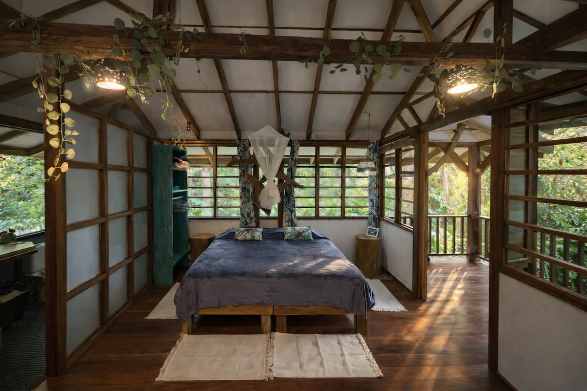 Spectacular open-air bungalow / treehouse - wildlife, surfer & yoga paradise! Wake up to the call of the birds, howler monkeys and waves crashing. Enjoy the day and night with sounds, scents and sights of the jungle & ocean. Fall in love with the amazing view! You can look forward to a unique outdoor living experience with wildlife encounters, private yoga with a 360° ocean & jungle view, and great surf, only 3min walk to the beach of Punta Banco and 15min by car to Pavones.