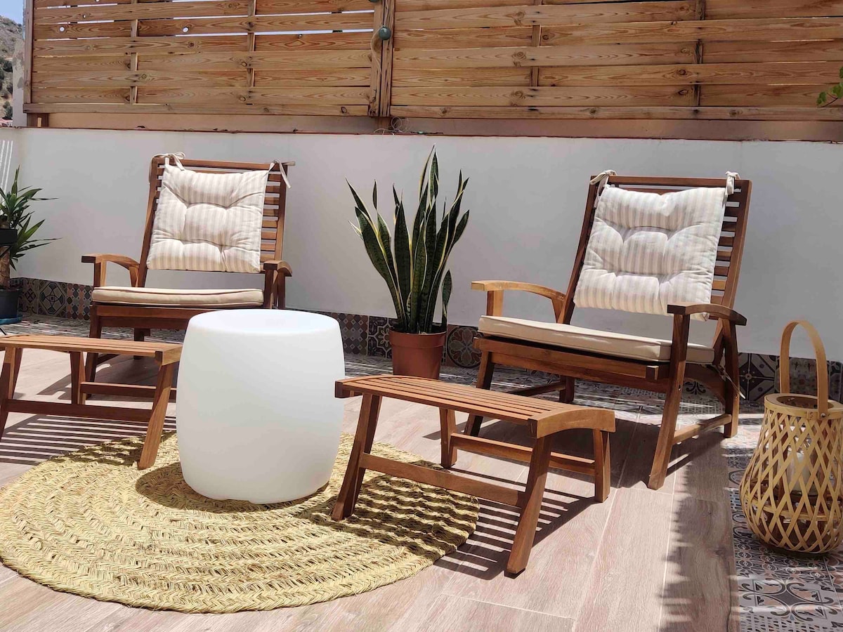 READ FULL DESCRIPTION. Wake up to views of the Sierra Nevada Mountains and the Lecrín Valley from your private terrace. This suite is located on the top floor of our farmhouse, with separate entrance. The suite is designed for your maximum comfort, with a bedroom with a 180x190 cm double bed, a private bathroom with a shower, a private living-dining room with a sofa bed, and a kitchenette (for storing and heating food). It is equipped with underfloor heating and ceiling fans.
