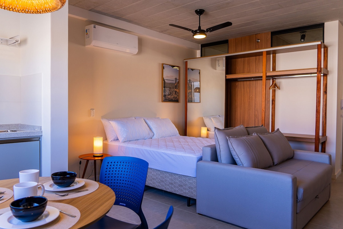Lindo apartamento de frente para o mar com cômodos espaçosos, arejados e aconchegantes. São dois ambientes, ambos com ar condicionado e ventiladores de teto. A suíte possui uma cama casal “queen”, armário amplo e banheiro completo. Na sala tem sofá cama de ótima qualidade que pode ser usado tanto como cama casal, como duas de solteiro, smartv com pacote básico, mesa de jantar e banheiro completo. Os chuveiros são ótimos. A cozinha é tipo americana, totalmente equipada, e muito bem iluminada.