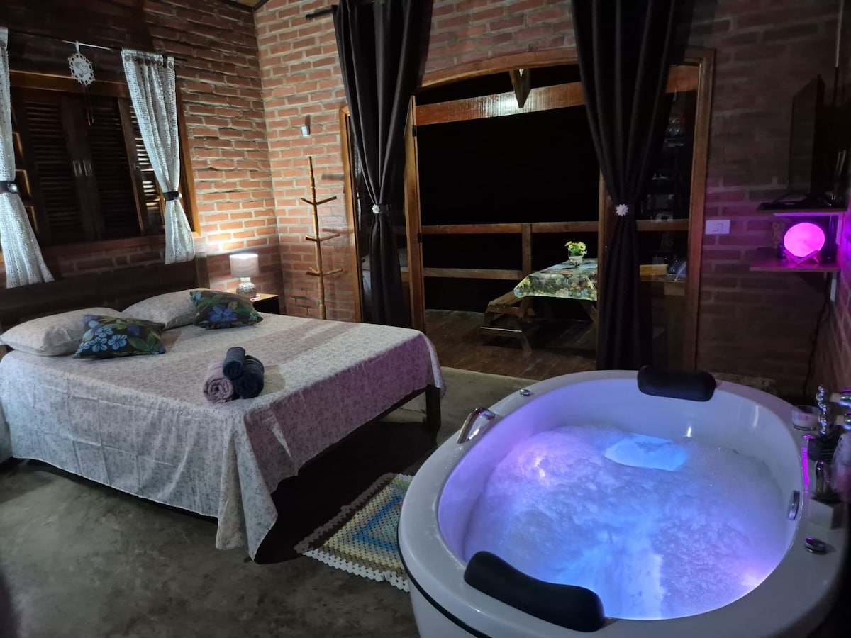 Stone Ark with a unique design, featuring a Mykonos-style mini-pool + hydro, lighting, sound, comfort, and sophistication, floating above the mountains of Gonçalves. Enjoy the stunning sunset, the magnificent starry sky, and stroll through the lush fields of the Green Mountains of Minas Gerais. “Experiencing Mont Sha’n is unique and inspiring: a journey of reconnection and energy renewal, with a strategic location for lovers of ecotourism, gastronomy, trails, and waterfalls.” 👇🏻