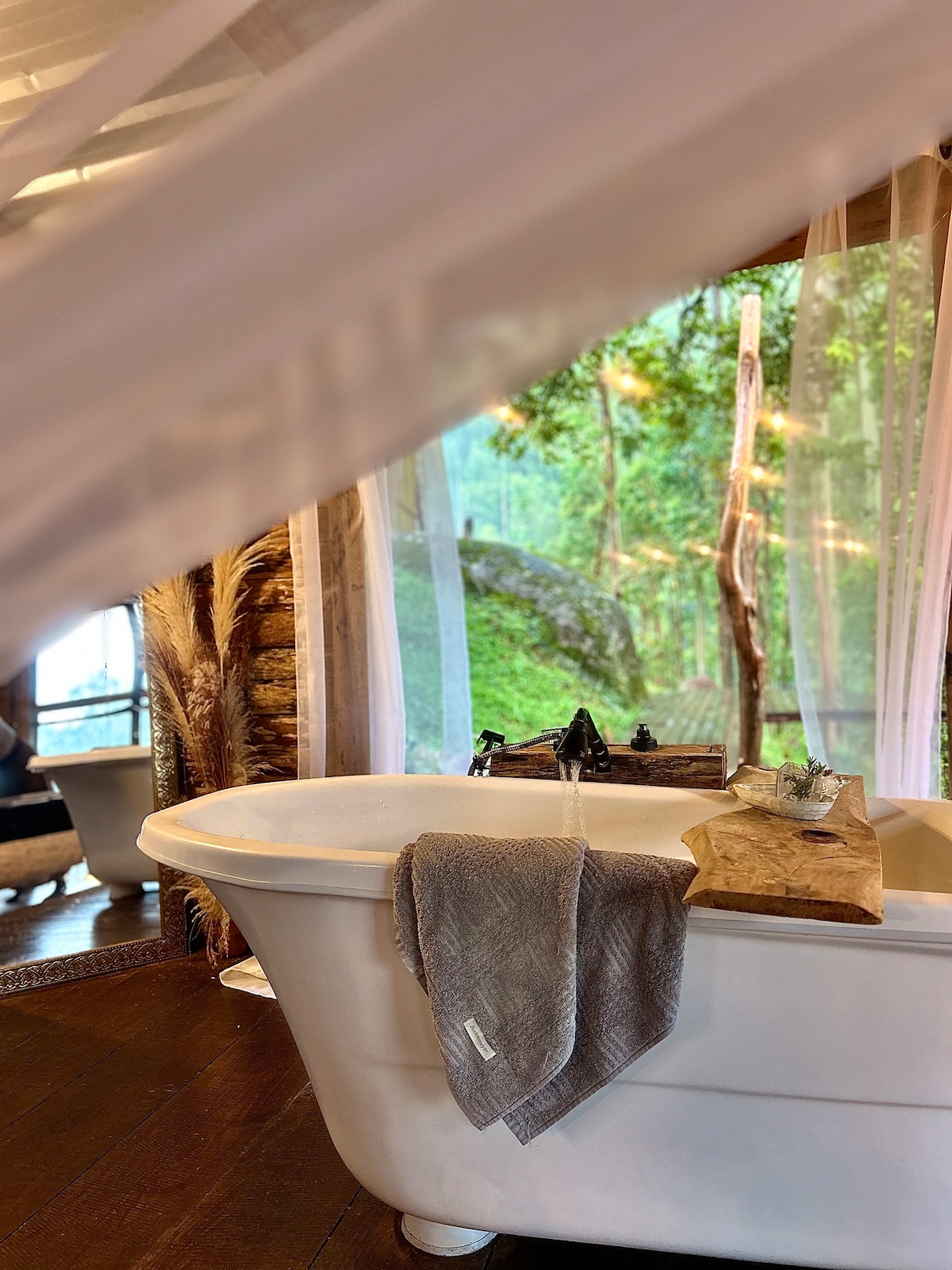 This brand new house sits high above the trees inside the Aldeia Rizoma eco village, a gated property 15 minutes away from the city historical center. The property offers a jungle gym, sauna (paid as an extra), private trails and access to 5 private waterfalls. The one bedroom studio has a king size bed built high so you can watch the forrest from it. It offers a private hot tube and a fully equipped kitchen. There is an extra bed that can be used for a third person with an extra fee per night