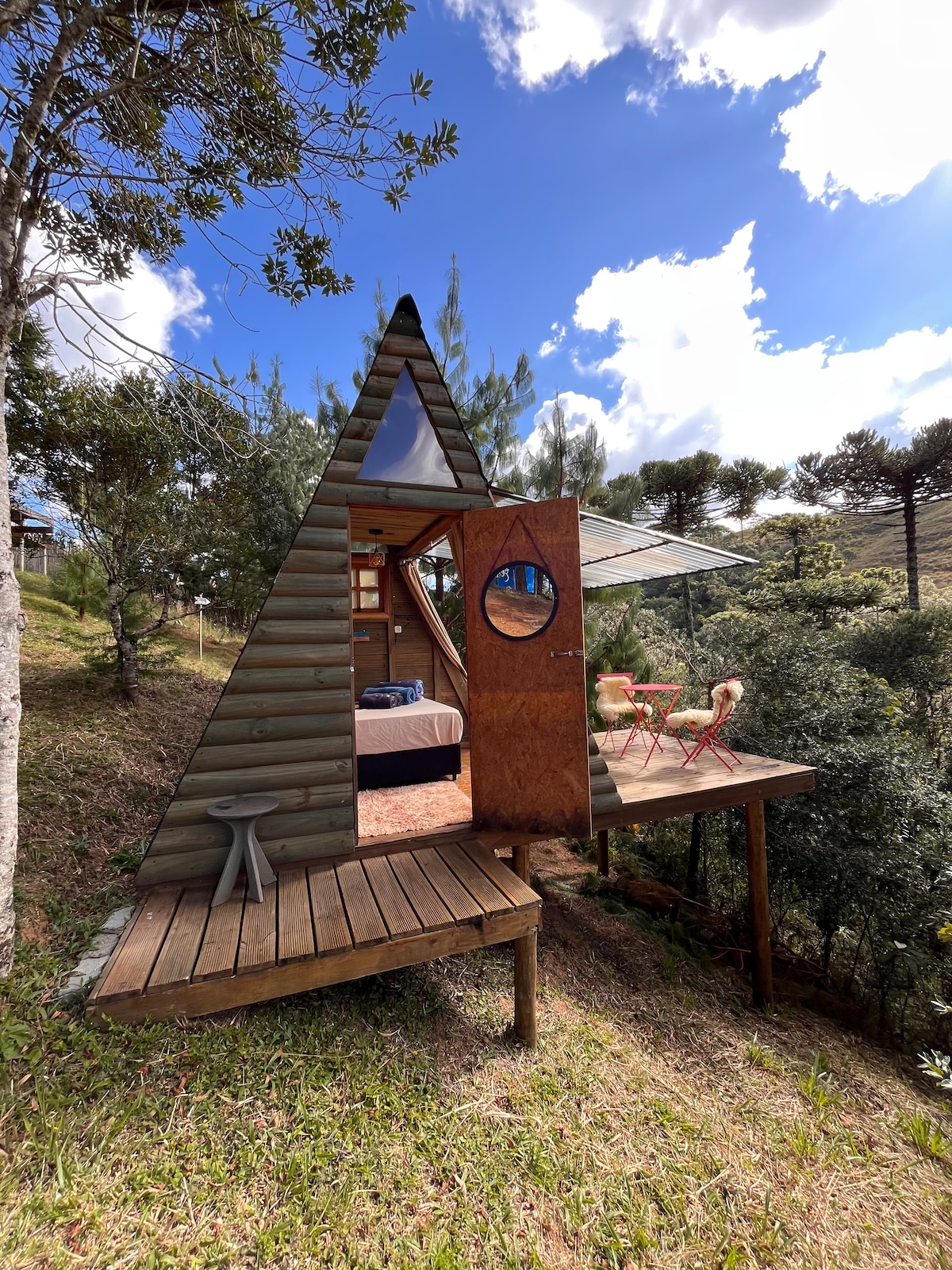 🍄 Cabana A-frame aconchegante com deck privativo em 20.000m² de natureza preservada + cachoeira e trilhas privativas! ⚠️ IMPORTANTE: Cabana e deck são PRIVATIVOS, mas cozinha/banheiros são COMPARTILHADOS (5 cabanas A-frame). ✅ Cama casal | Enxoval completo | Aquecedor | WiFi Starlink 🌲 Cachoeira | Trilhas (900m + 3,5km) | Fogueira | Céu estrelado 🐕 Conheça a Bertinha, nossa anfitriã de 4 patas que adora trilhas! Perfeito para casais, trabalho remoto, pets e amantes da natureza.