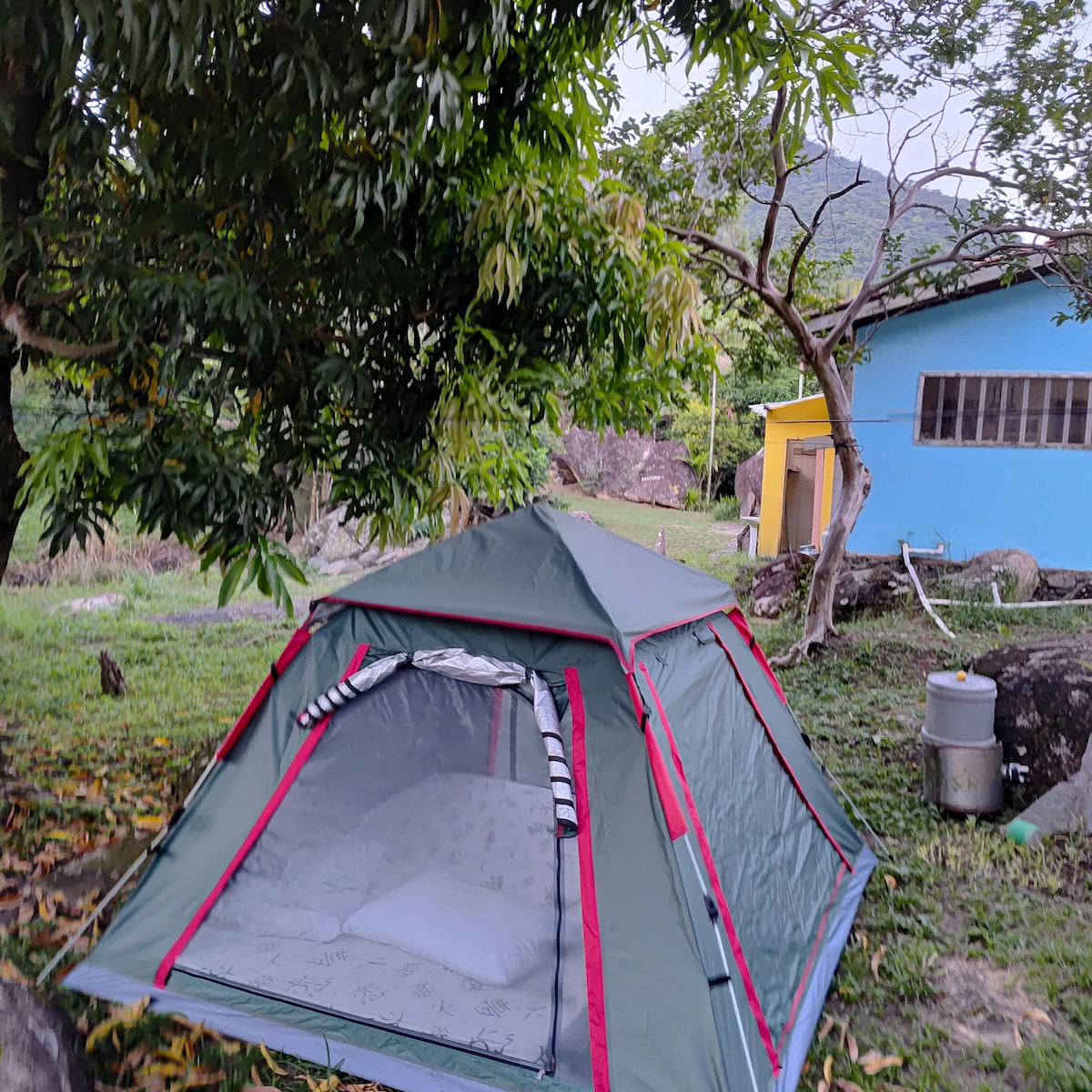 Acomodação em barraca Quechua, colchão densidade 20, banheiro privativo com chuveiro elétrico, pontos de luz, iluminação, wi-fi, churrasqueira, casinha na arvore, cama elástica, estrutura para fogueira, cozinha com fogão de lenha, animais, piscina, horta, local seguro com uma vista incrível ao redor de uma mata nativa!