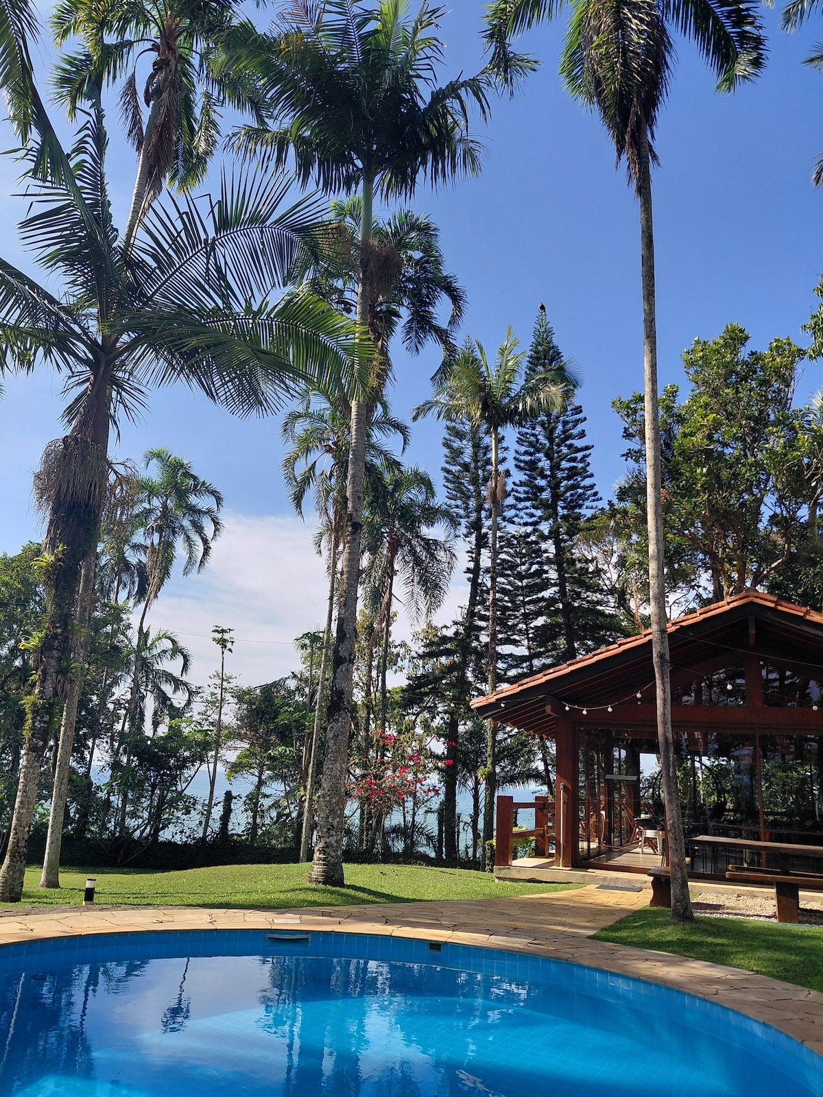 A place with the most incredible view of the sea, views of Flamengo Bay, Anchieta Island, Santa Rita Beach, Lamberto, Ribeira and others… With a private trail in the Atlantic Forest, 2 incredible viewpoints, small waterfalls with crystal clear water! With security and privacy, the Greece-themed house has a comfortable and structured 300m2, airy and fresh and with new air conditioning in all bedrooms. The closest beach is Lamberto Beach, you have to walk 400m, but we recommend going by car!