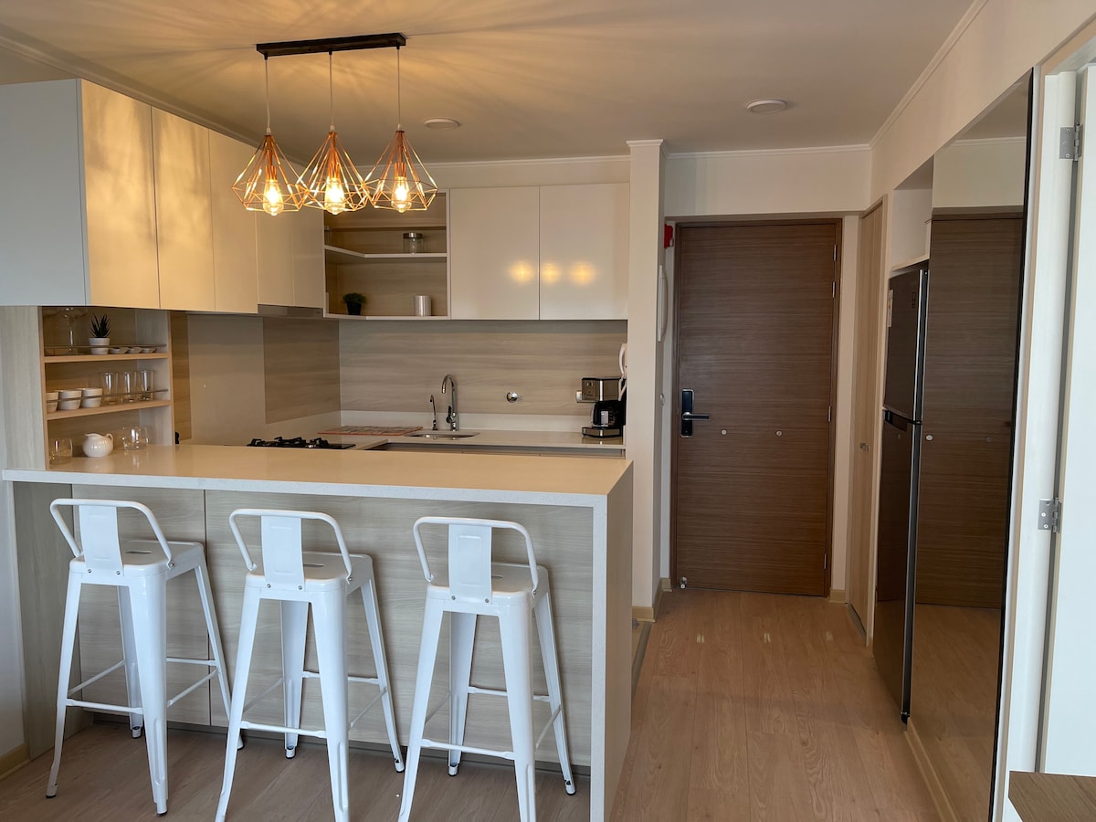 Departamento súper bien ubicado en Surquillo, cerca a distritos como Miraflores, San Isidro, San Borja y Surco, cerca a centros comerciales y avenidas grandes, ideal para familias ya que cuenta con 1 dormitorio con TV de 55" con cama queen, sofá cama, baño completo, Kitchenette, sala con TV de 86", y todo lo necesario para una buena estadía, piso 10. Cuenta con zona común de parrillas, sala de billas, gimnasio, cine, lavandería industrial, zona de parrillas (previo pago).
