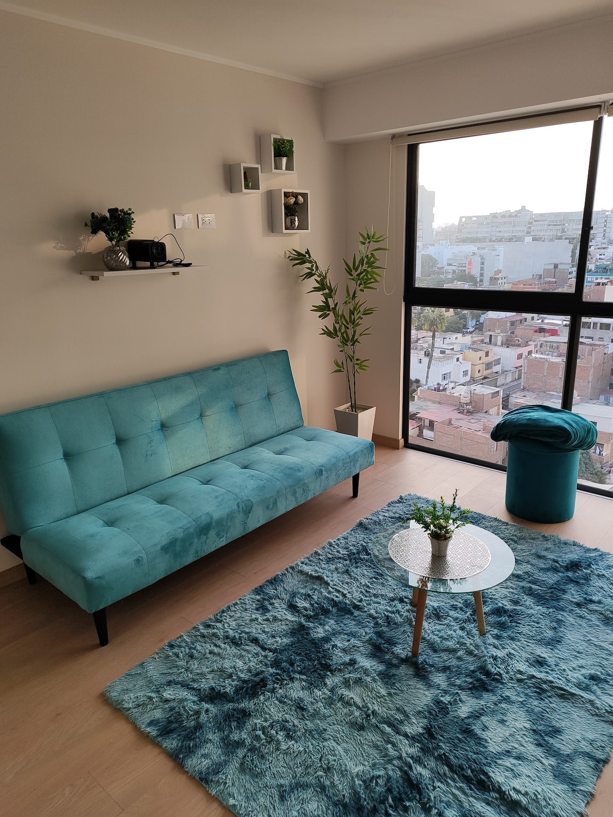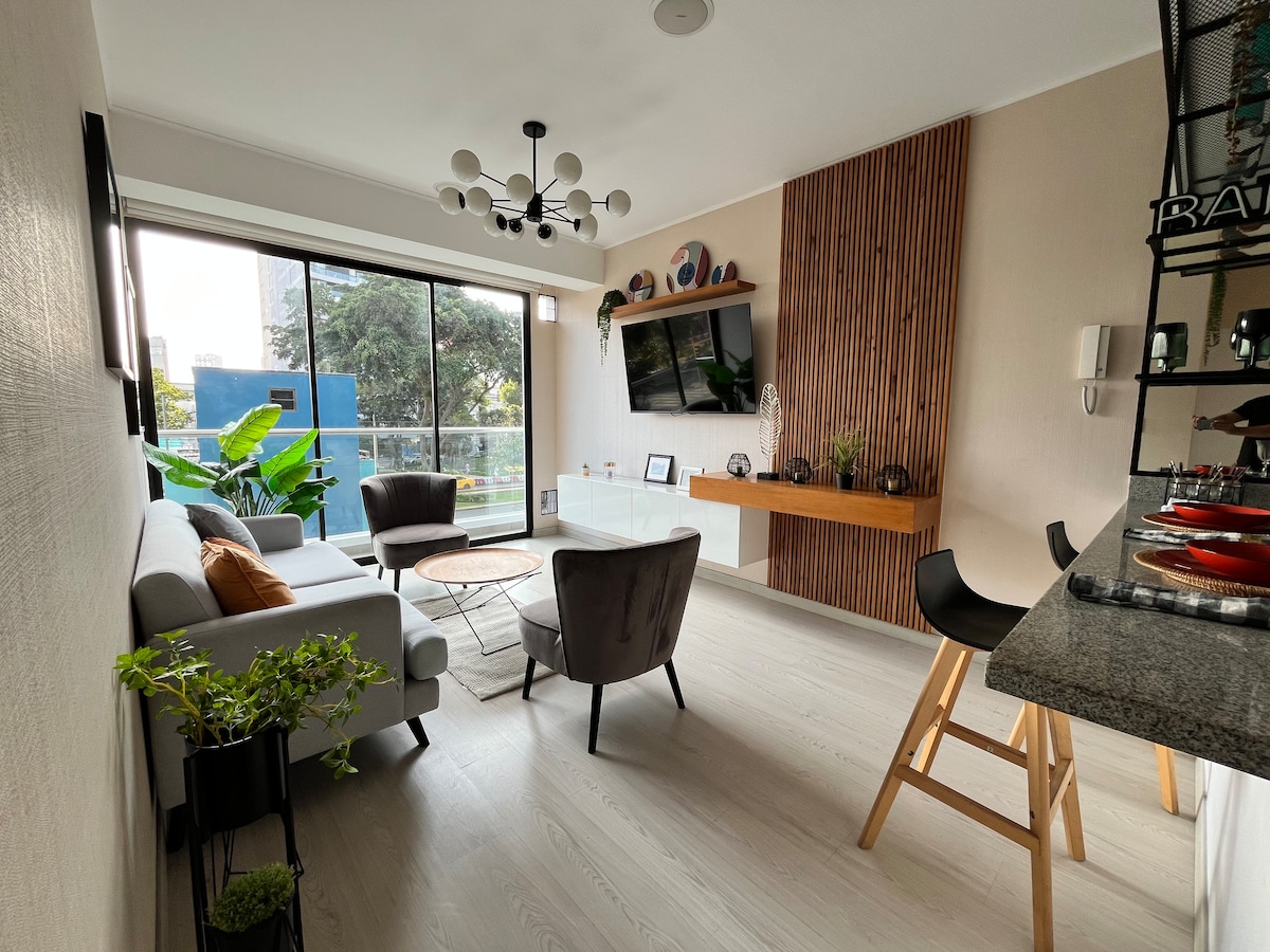 Brand-new, spacious and fully equipped apartment just 350 m from the Miraflores oceanfront. Perfect for relaxing, working, or enjoying a home cinema experience with its HD projector and automatic screen. Features 2 bedrooms (master with queen bed and 4K Smart TV), a cozy living room with queen sofa bed, and a balcony with side ocean view. 100MB high-speed WiFi. We have parking. Top location near Larcomar, cafes, museums and restaurants.
