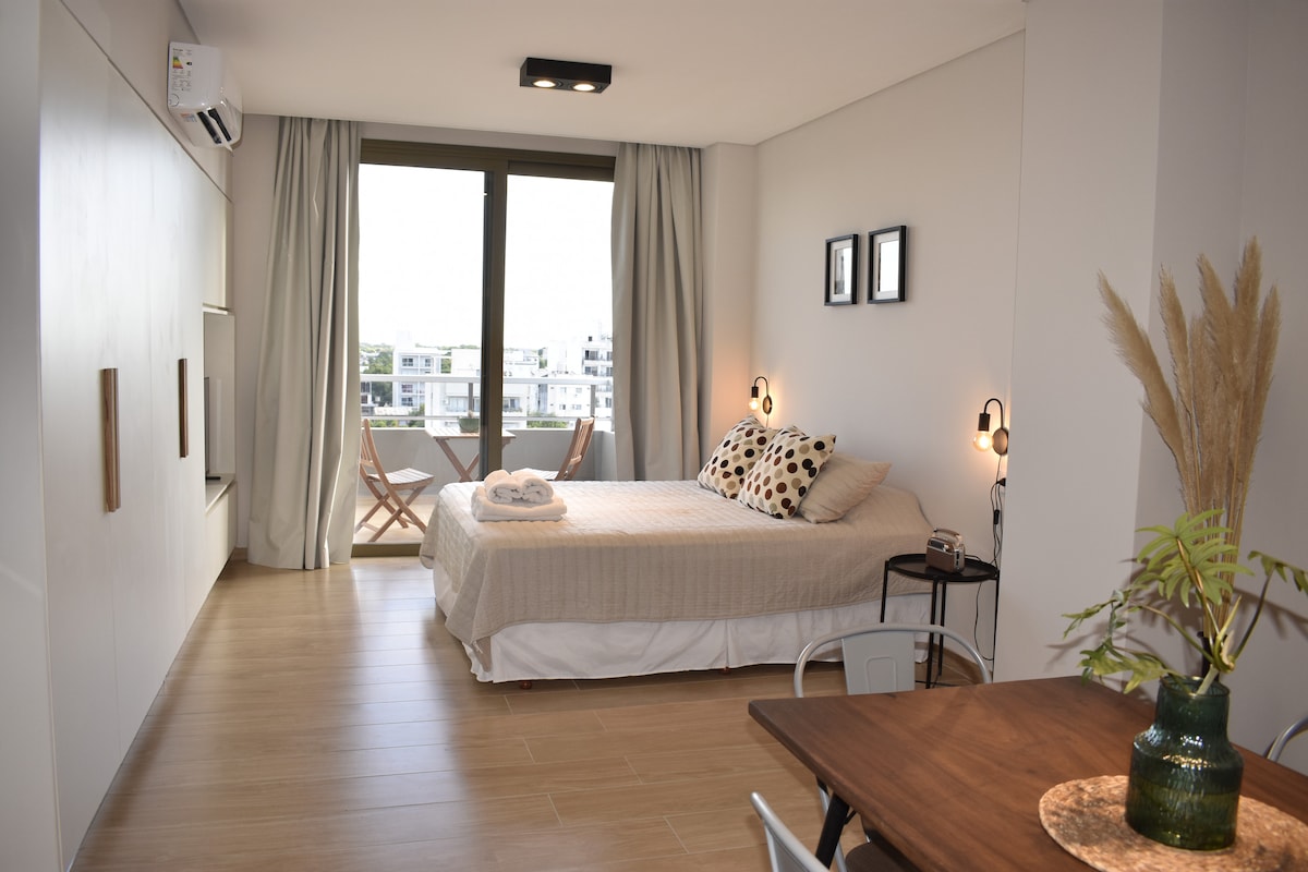 Disfruta de la calidez de este departamento a estrenar. De ubicación privilegiada, céntrica y segura (a 300 mts de la peatonal, 200 mts de la costanera y parque camba cua, a unas pocas cuadras de las playas). Cuenta con una cama matrimonial y una cama marinera, aire acondicionado frío/calor, TV, wifi, ropa de cama, baño completo privado, terraza con lavandería, edificio con SUM con parrilla (sujeto a reserva previa)