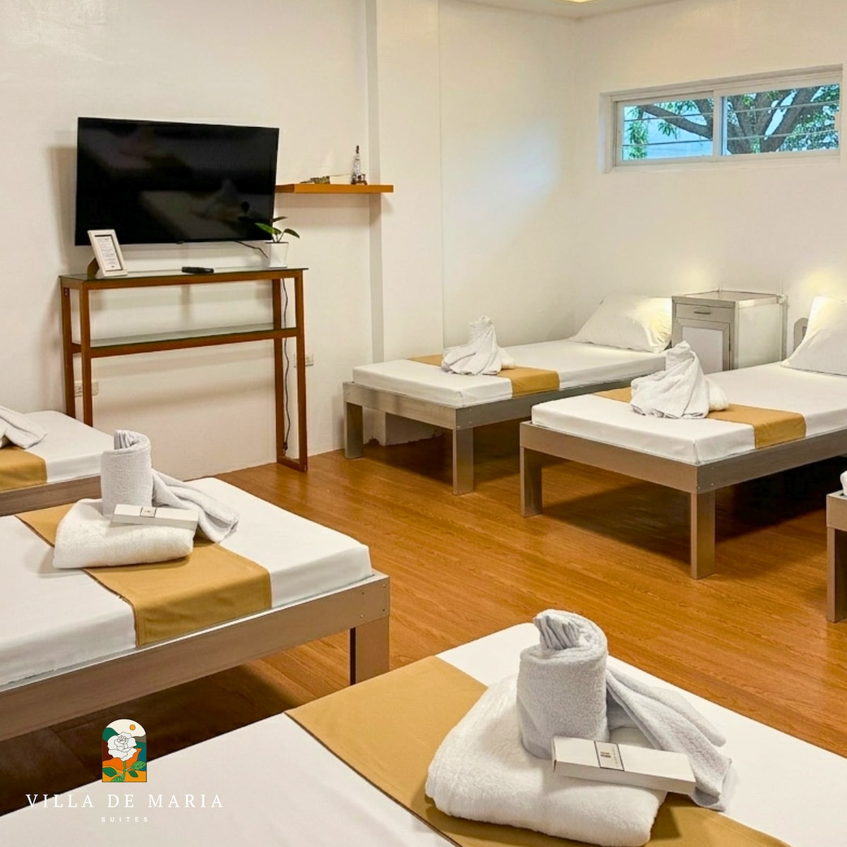 Aquamarine Suite of Villa de Maria Suites is a charming dorm-style retreat ideal for 4–5 guests seeking comfort and serenity. Enjoy a 43" Smart TV, free Wi-Fi, and hot & cold showers with a hair dryer, fresh towels, and toiletries provided. The naturally cool evening breeze adds to the relaxing mountain atmosphere. Guests also enjoy access to Villa de Maria’s peaceful chapel, gazebo, pond, and gardens—perfect for quiet mornings, reflection, or bonding moments surrounded by nature.