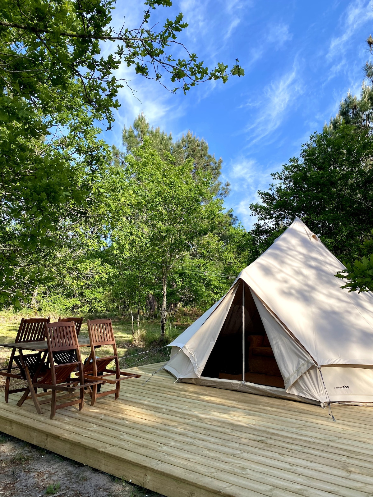 Located in the La Téouleyre natural area, 7km from the ocean (direct access to the cycling path from the property), we offer our customers looking to get closer to nature during their holidays the "Oak Tipi," set up on a wooden platform under the oak grove. Enjoy a camping experience in a relaxing setting, thanks to this fully equipped tent: Large 160 bed, Glass minibar, Senseo coffee maker, and electric kettle.