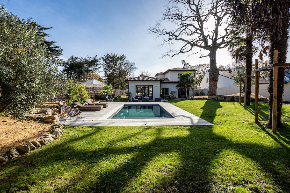 Au centre de la baie de Bourgneuf, face à l'île de Noirmoutier, lieu prisé pour la pêche à pieds. Maison de famille avec terrasses face à l'océan , piscine découverte chauffée, places libres pour voiture, terrain clos, espaces de détente partagés. Accès direct à la plage par le sentier piétonnier des douaniers. A 3 km des commerces et 5 km de Pornic. Navette estivale gratuite à 100m avec des circuits sur toute la côte du pays de Retz. Calme et repos pour un dépaysement d'exception.