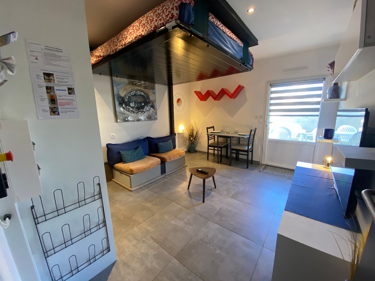 Dear future traveler(s), This accommodation was built using sustainable materials that aim to be environmentally friendly. The layout was created using products from various reuse networks to avoid overconsumption. The studio is independent from our house with its own private entrance. It offers a separate sleeping area as well as a terrace overlooking a garden. The beach is a 10-minute walk away and the train station is a 5-minute drive away.