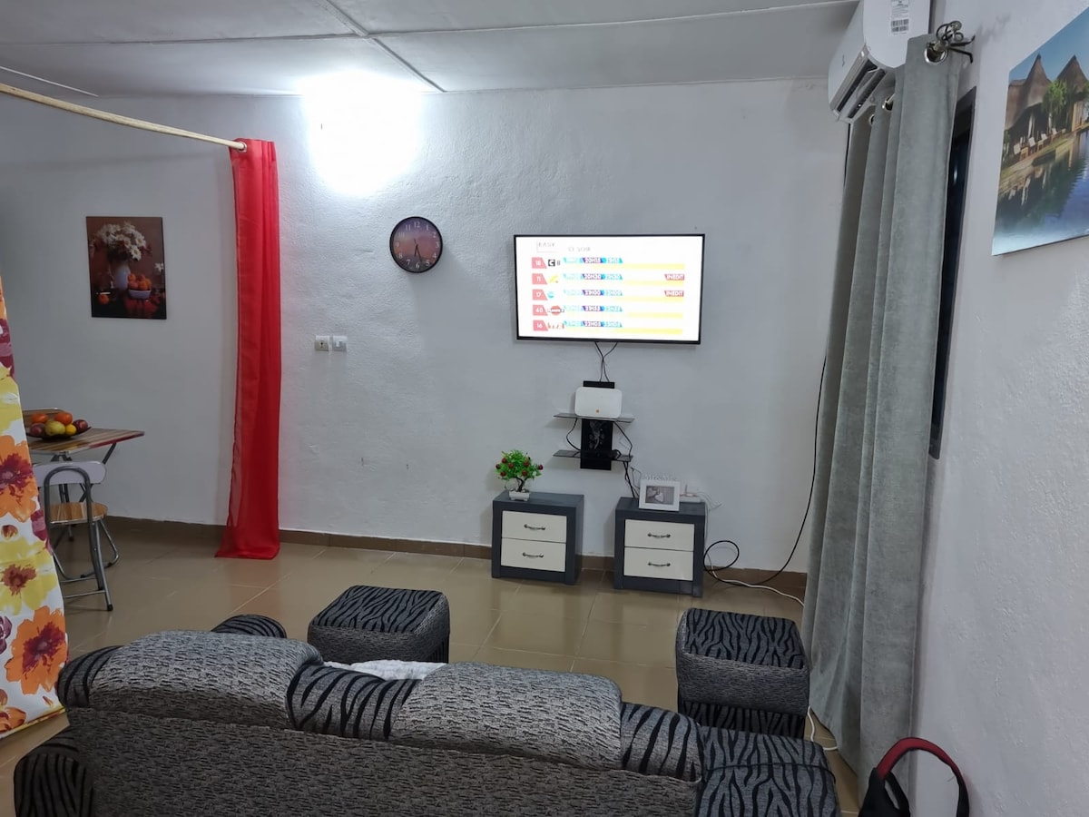 Property Description Enjoy a relaxing stay in this brand-new, comfortable duplex, ideally located in Cocody Angré. -1 large bedroom with access to the balcony -Beautiful living room with a comfortable (convertible) sofa -Fully equipped kitchen -Bathroom with all amenities Highlights 🌐 High-speed WIFI 🧹 Cleaning 2 times a week 📺 TV with cable channels ❄️ Air conditioning, hot water 🧺 Laundry facilities possible Ideal Location 🛍️ Close to all amenities 🏞️ Quiet neighborhood 🚗 Easy access