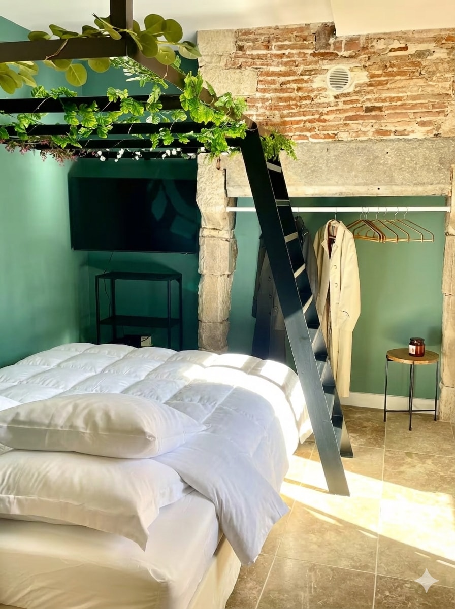 Dans une résidence privée, le duplex peut accueillir jusqu'à 4 voyageurs avec à l'étage une grande chambre (lit queen size, vidéo projecteur avec Netflix et Disney +) et une spacieuse salle de bain avec baignoire à remous. Vous disposez d'un canapé convertible avec matelas pour une qualité de couchage optimale. La terrasse avec barbecue vous permettra de profiter par beaux temps d'un repas à l'extérieur. Proche de toutes commodités (restaurants, bars, supermarchés, tabac, boulangerie).