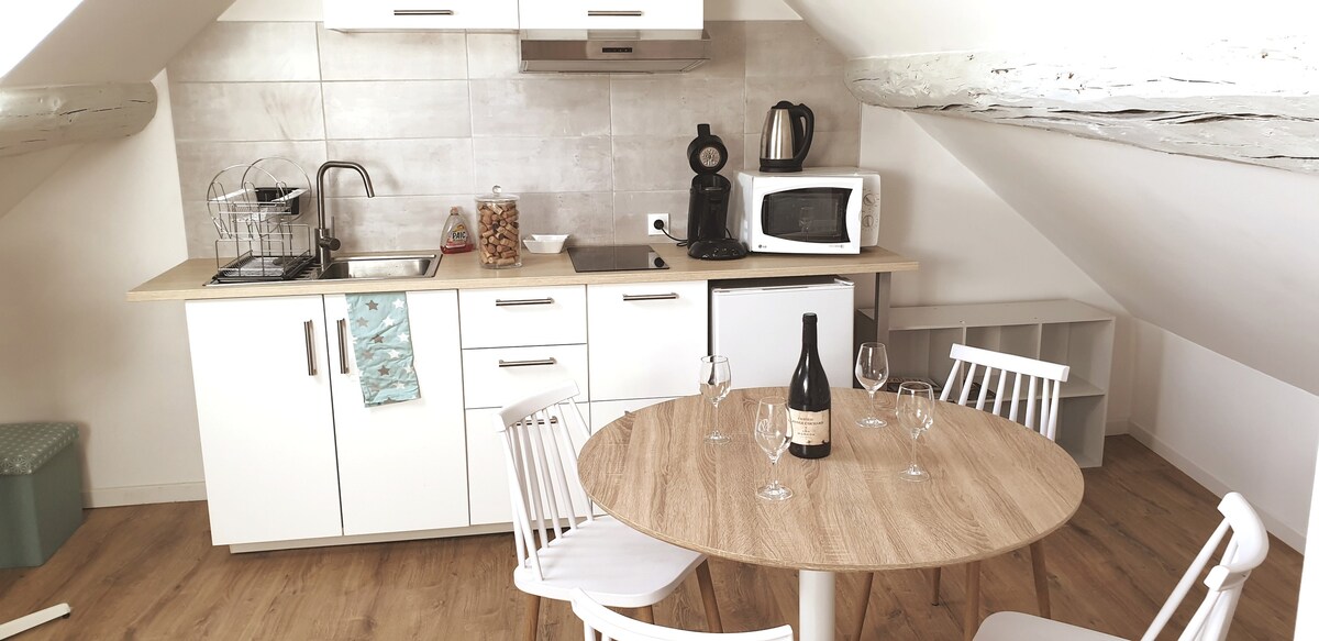The apartment is in a small house with a common terrace to drink its coffee in the sun. Close to the vineyards, the historic centre and a romantic park where you can take a boat ride. You will be 8 minutes walk from the town centre and the hospices of Beaune. A supermarket, bakery, fish shop down the street. Discover the vineyard on foot or by bike as the green way is right next door. The apartment is ideally located to enjoy Beaune on foot.
