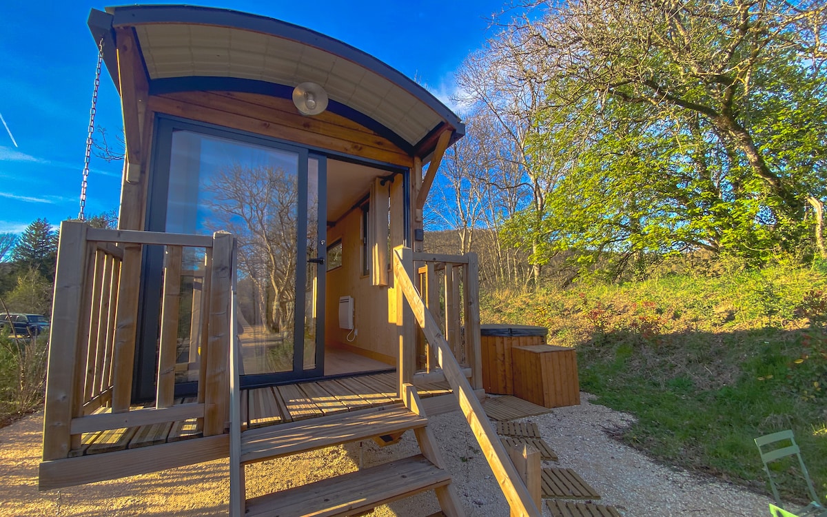 Nestled in the peaceful hills of Burgundy with the vineyards of Beaune just a stone’s throw away, The Writer’s Cabin is the perfect cozy hide away to unplug, slow down and recharge. For a romantic get away, some me-time all by yourself or to work an a creative project. Relax as you enjoy the views of the woods, admire the incredibly starry skies we get here from your private hot tub or read a book in the swing chair on the deck or curled up in the sofa inside in front of the wood burner.