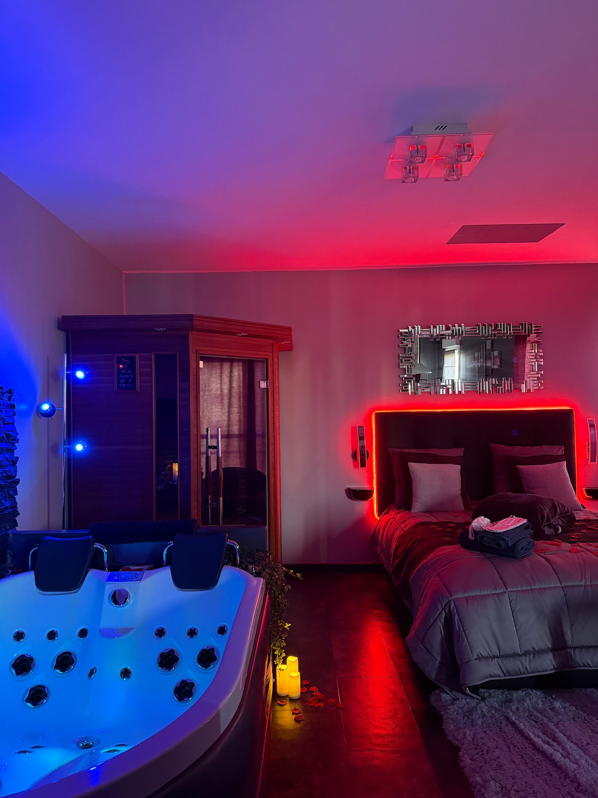 ✨ Évadez-vous dans un lieu hors du commun, où luxe et sensualité se rencontrent. Balnéo privative, sauna, fauteuil tantra et coin jeux de société vous invitent à la détente et au plaisir. Laissez-vous surprendre par une expérience immersive unique : Un jeu d’énigmes mystérieux conçu pour vous plonger dans une aventure intime et pleine de surprises. Dans ce cadre raffiné, tout est pensé pour les couples en quête de complicité : une ambiance chic, des lumières douces et un confort haut de gamme.