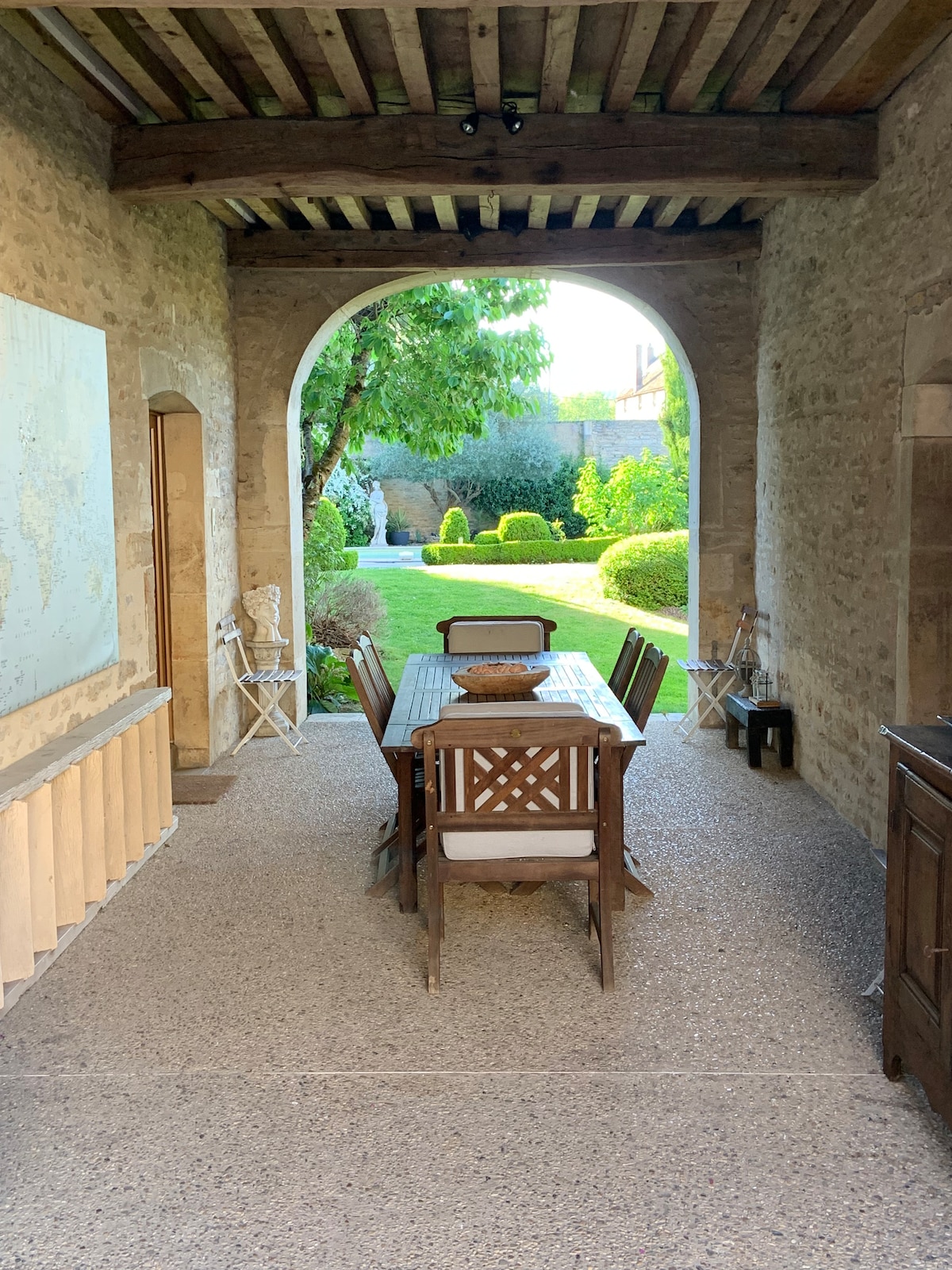 Former artisanal oil mill in a peaceful countryside setting near Beaune. Independent house perfect for weekends with friends. Large living room with fireplace and big table, equipped kitchen, 4 bedrooms and an extra sleeping area downstairs (sofa bed). Two bathrooms. Spacious terrace opening onto a leafy garden with summer BBQ. Bucolic, authentic atmosphere - ideal for cooking, relaxing and enjoying the fire.