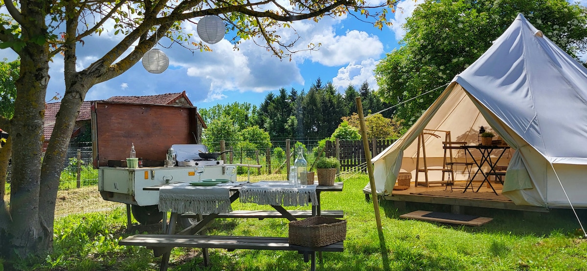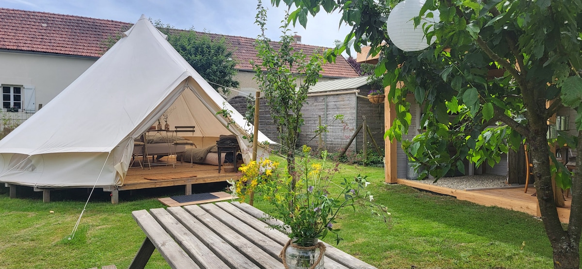 Camperen met comfort kan in onze sfeervolle bell tent van 5 meter doorsnede, gelegen op een charmante minicamping in de tuin van een 200 jaar oude pastorie. Wordt wakker tussen de fruitbomen en met een verfrissend zwembad binnen handbereik. Zeer centraal gelegen nabij het historische stadje Autun en met tal van wandel- en fiets mogelijkheden vanaf de camping. Een uitgebreid ontbijt kan worden verzorgd voor een meerprijs van €10 per persoon.