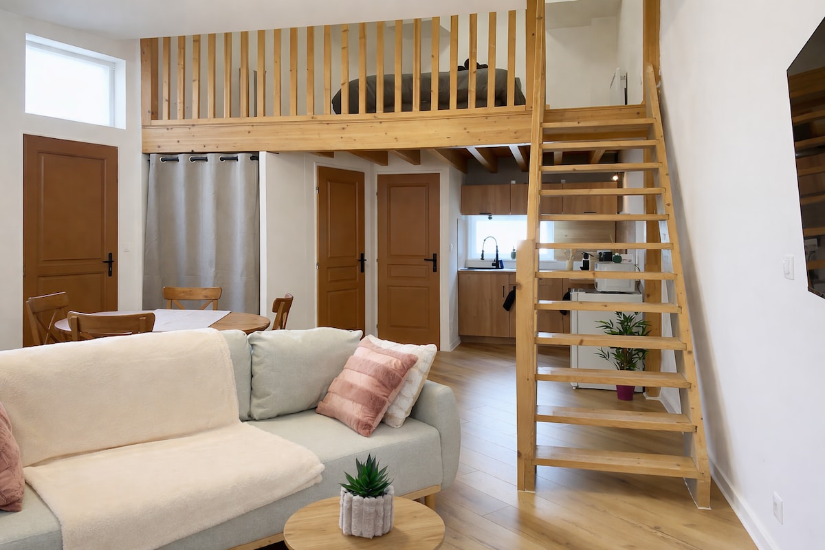 Séjournez dans ce T2 cosy et atypique avec chambre en souplex et vue imprenable sur la rivière. Entièrement rénové, l'appartement offre une ambiance chaleureuse et intime. À 5 min à pied de la Cité de la Gastronomie et à 1 km de la gare, il allie calme, confort et style. Cuisine bien équipée, clim réversible, Wi-Fi gratuit. La Chambre est spacieuse et est accessible par escalier en colimaçon. Parking en option sur demande.