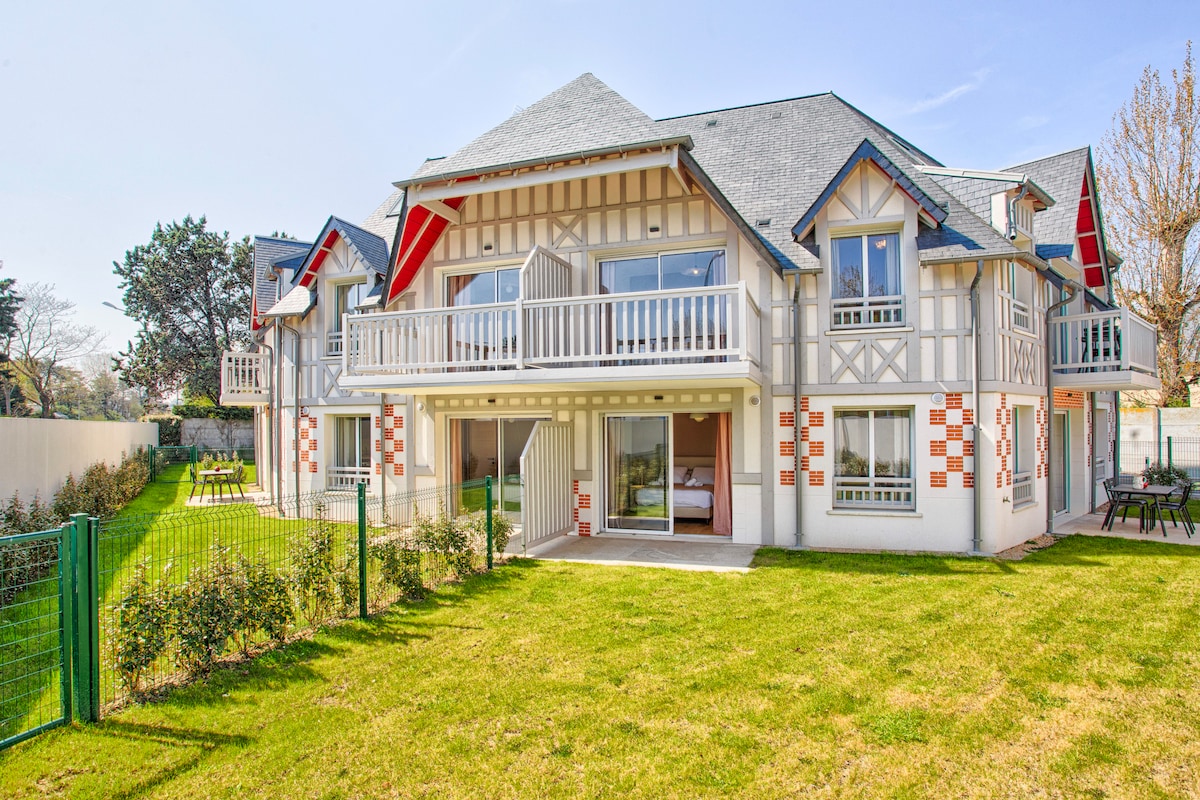Maison Individuelle à 2km de Deauville. Plage sable fin 370m. Jardin privatif entretenu 600m². Meubles de Jardin, Barbecue. Bus, Boulangerie/Pâtisserie 120m. Hippodrome 300m. Supermarché 800m. Gare SNCF 2,8Km. Terrain de Golf 3,5 km. Photos contractuelles: mobiliers rustiques. Lave-linge, sèche-linge, fer à repasser, sèche-cheveux. Canapé-lit du séjour d'appoint (matelas supérieur derrière le canapé). Draps, serviettes fournis. Animaux acceptés, jardin clos : grillage brise vue hauteur 1,20 m.