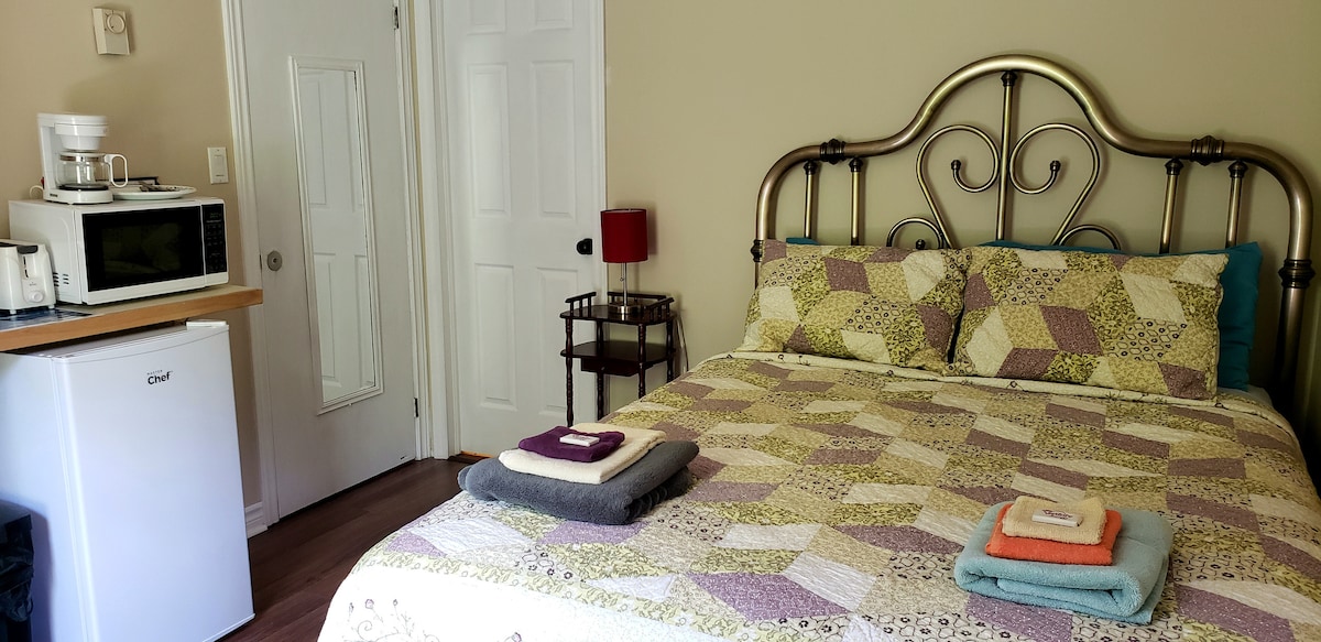 Ce coin indépendant de notre maison devient chez vous le temps de votre séjour! Suite récemment rénovée avec entrée indépendante et autonome. Dans un quartier paisible, avec stationnement gratuit et accès Wifi inclus. Cuisinette équipée: ustensiles, assiettes et autre, petit frigo, four grille-pain. Salle de bain privée. Literie et serviettes incluses. Il ne manque que vous!