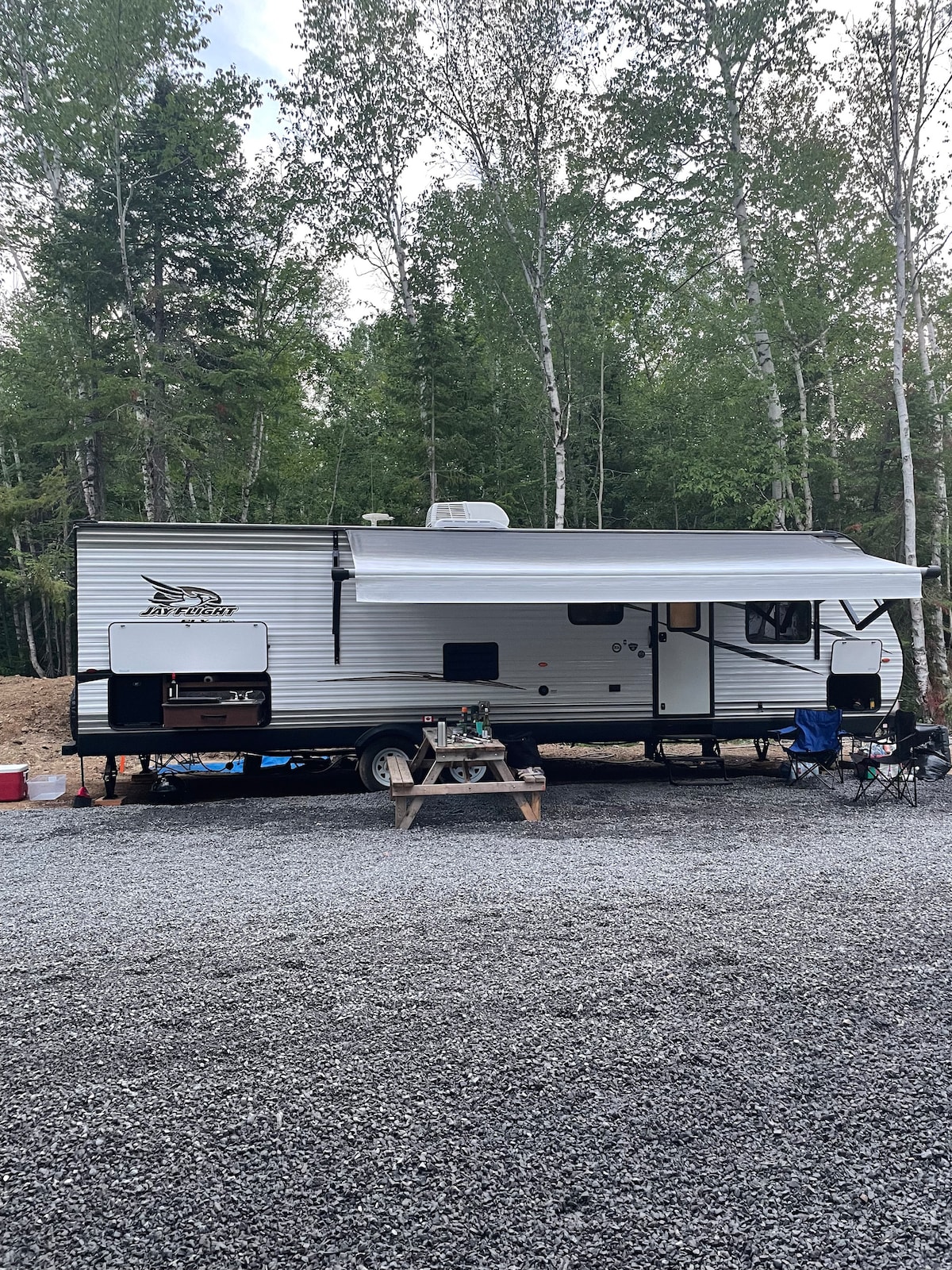 Enjoy the sounds of nature when you stay in this unique place. 28 ft Trailer on private 36 acres backing onto the Nigadoo river. 10 minutes from all amenities and ocean. 1 Queen bedroom, Two bunks, couch and dinette fold into added sleeping space. Enjoy glamping at its finest with hydro, well and septic. Explore 36 acres of virtually untouched northern forest. Close to ATV trails and fishing and outdoorsman’s dream that they can bring the wife to!
