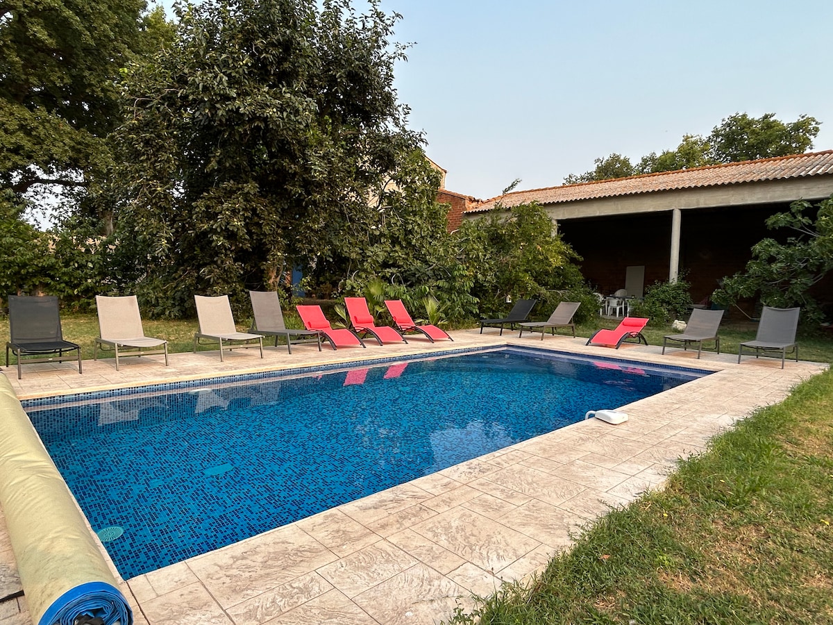 Logement entier de 55 m² avec une entrée totalement indépendante situé dans la maison que nous habitons . Salon, TV satellite , WIFI sur Fibre Optique, cuisine entièrement équipée (lave vaisselle et lave linge), chambre avec un lit Queen size (160X200) et une salle de bain avec douche et WC. Logement climatisé. Piscine à débordement avec cascade et plage immergée de 10m2. Eau purifiée au sel. Bassin de 10X5 mètres uniquement pour vous. Une grande pergola de 30m². Brasero pour vos grillades.