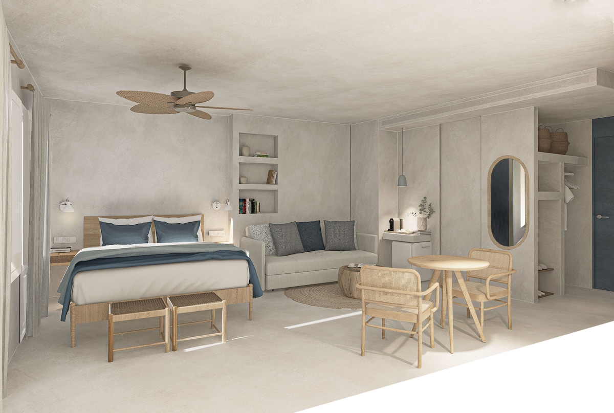 Hotel L’Oasis enjoys a prime location, right in front of the beach, in the heart of a charming little village. It is situated at the start of the rocky coastline, known for its picturesque coves. Shops and restaurants are just a short walk away. The hotel offers 4 sea-facing rooms, each with a private terrace and air conditioning, as well as 5 village-side rooms. This listing refers to Room located on the village side.