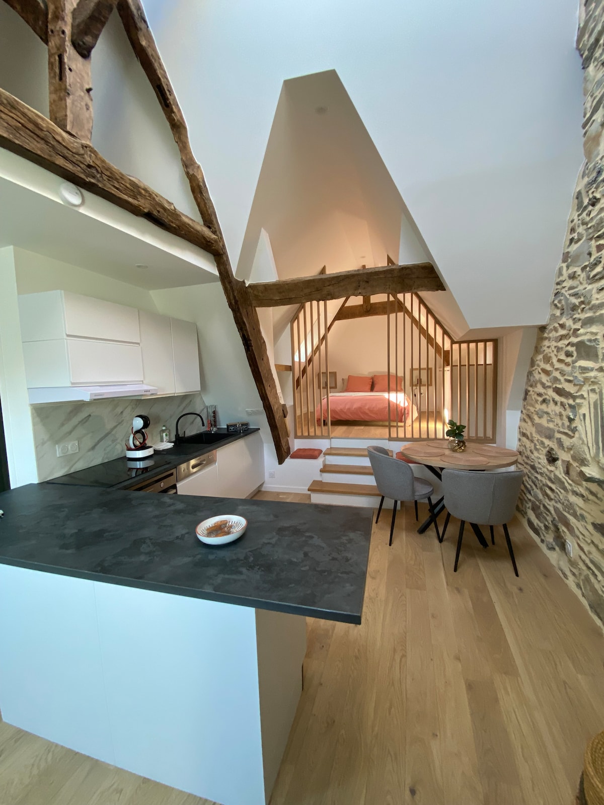 Romantique room, au cœur de la Bretagne, avec vue sur le canal. Le confort à été apporté pour les couples, baignoire balnéo deux places dans le SALON, lit spacieux à baldaquin 180/200 cm. Un patio pour les fumeurs et non fumeur, cosy intérieur, lumineux. Pour les personnes sensibles aux bruits, je déconseille, le bien est situé en ville dans une rue passante.