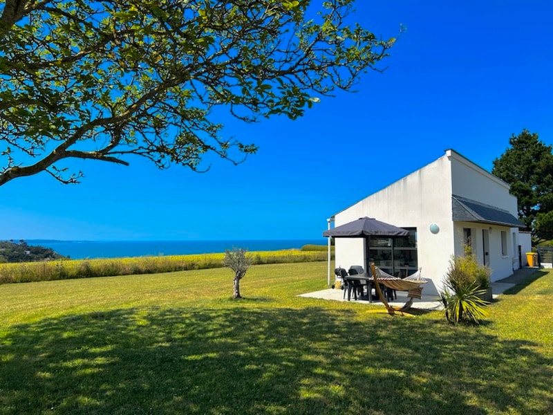 Maison récente de 71 m2, lumineuse, située à mi-chemin entre le bourg et la plage. La maison est constituée d'une grande pièce de vie (salon-séjour- cuisine), d'une salle de bain et de 2 chambres (une avec mezzanine). Une grande terrasse aménagée côtés Sud et ouest vous permet de profiter du soleil. L’environnement est très calme (chemin agricole), la maison est à l’écart de la route et sans aucun vis-à-vis. Vous bénéficiez d’une vue sur les cultures environnantes et d’une petite vue sur la mer.