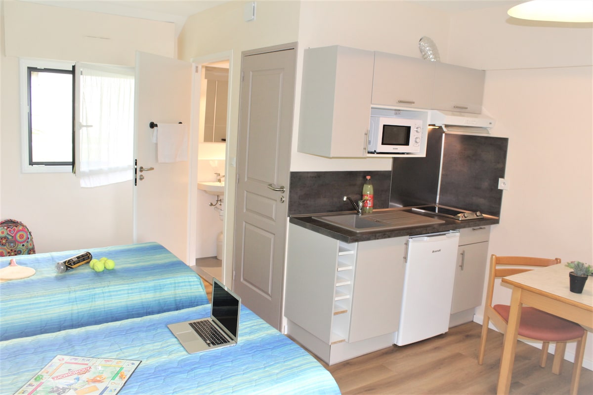 Gîte composé de deux studios communicants, chacun avec kitchenette, coin repas, sanitaires, TV et Wi-Fi. Quatre lits 90x200 modulables en deux lits 180. En saison du 4 juillet au 22 août : accès gratuit à la base de loisirs soit 40 heures d’animations hebdomadaires : canoë, kayak, tir à l’arc, escrime, etc. À 150 mètres des gîtes, une piscine intercommunale chauffée à 28 °C propose quatre bassins, un sauna, un hammam et un toboggan. Elle est ouverte tous les jours de 14h30 à 19h00 et surveillée.