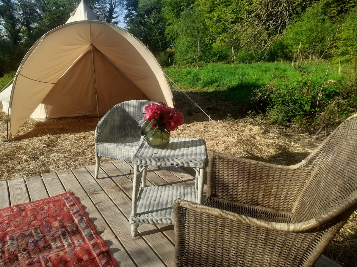 Au coeur d'une petite ferme où la vie est douce et belle, une belle tente spacieuse vous attend pour des nuits calmes où seul le gazouilli des oiseaux viendra vous réveiller en douceur. Chaque tente est équipée de 4 lits avec de bonnes couettes, d'une belle table de pique-nique réalisée avec le bois du lieu, et d'un petit salon d'été. Jolie cuisine collective et sanitaires à proximité, vous serez charmés par ce lieu insolite au coeur d'une nature généreuse.