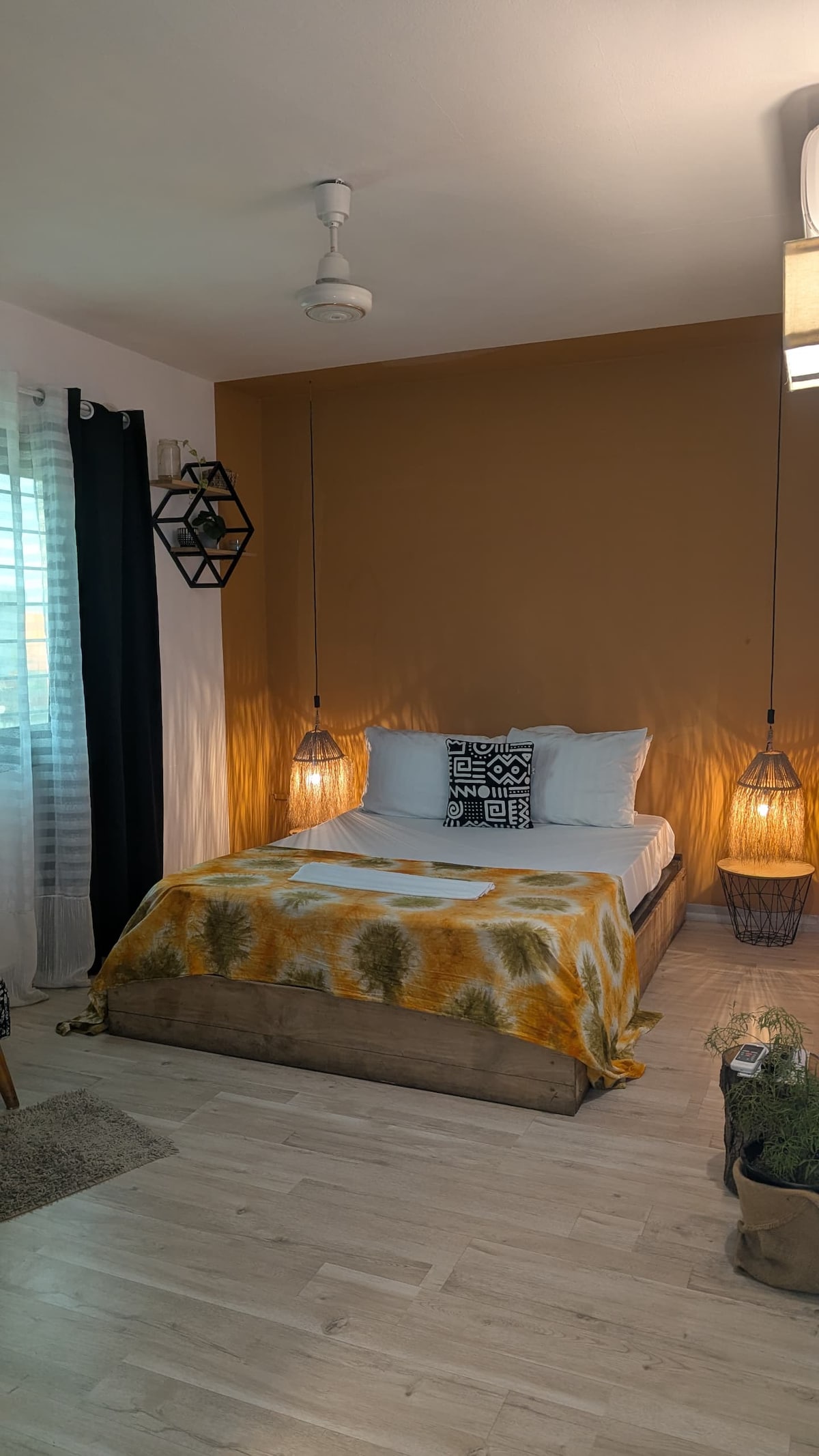 La maison de CanelYa (quartier Fidjrossè), est une maison d'hôtes proposant cette chambre privée, dans un cadre convivial à moins de 5 minutes de la plage. Idéale pour les voyageurs en solo ou en couple, cette chambre s'ouvre sur une grande terrasse sur toit(partagée). La résidence est appréciée pour son accueil chaleureux, on jardin. Son plus? Le jardin Restaurant-Bar, un cadre plein air cosy, pour se détendre, recevoir. Des cocktails en tout genre, et mets cuisinés par nos chefs!