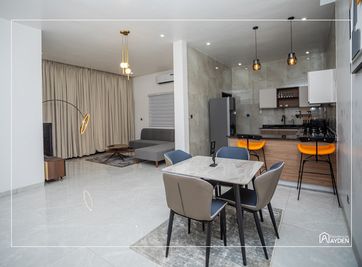 Ayédoun, est un cocon de deux pièces aménagé avec passion dans un style moderne et épuré. A deux minutes de la mythique place de l'Etoile Rouge, il est entièrement climatisé, très bien équipé et connecté à la fibre optique (wifi haut debit). L'un des gros avantages de cet apart est indéniablement sa proximité avec plusieurs commodités: Supermarché, marché moderne, restaus, pressing, salle de cinéma, guichets automatiques, etc... Immeuble sécurisé, accès facile et Service de navette disponible
