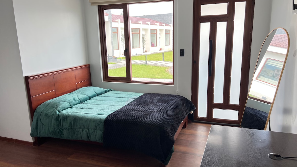 Una suite hermosa amoblada y com todas las comodidades , dormitorio , sala para una persona más , cocina , baño , patio hermoso , todo privado , la vista la amarás , el volcán y las luces de la ciudad en la noche son de ensueño !