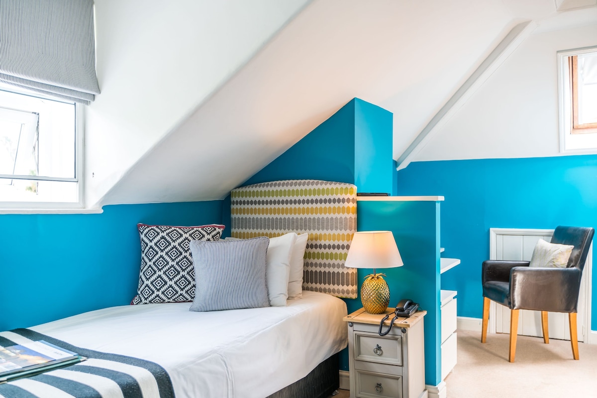 Nestled in the countryside at The Queens Chew Magna, this two-story room blends character, charm, and luxury. The first floor has a cosy lounge area with a sofa bed and flat-screen TV, perfect for relaxing. Upstairs, a King bed with an en-suite walk-in shower. Enjoy luxurious cushions, throws, and complimentary White Company toiletries. Tea and coffee-making facilities are included, ensuring a comfortable and restful stay.