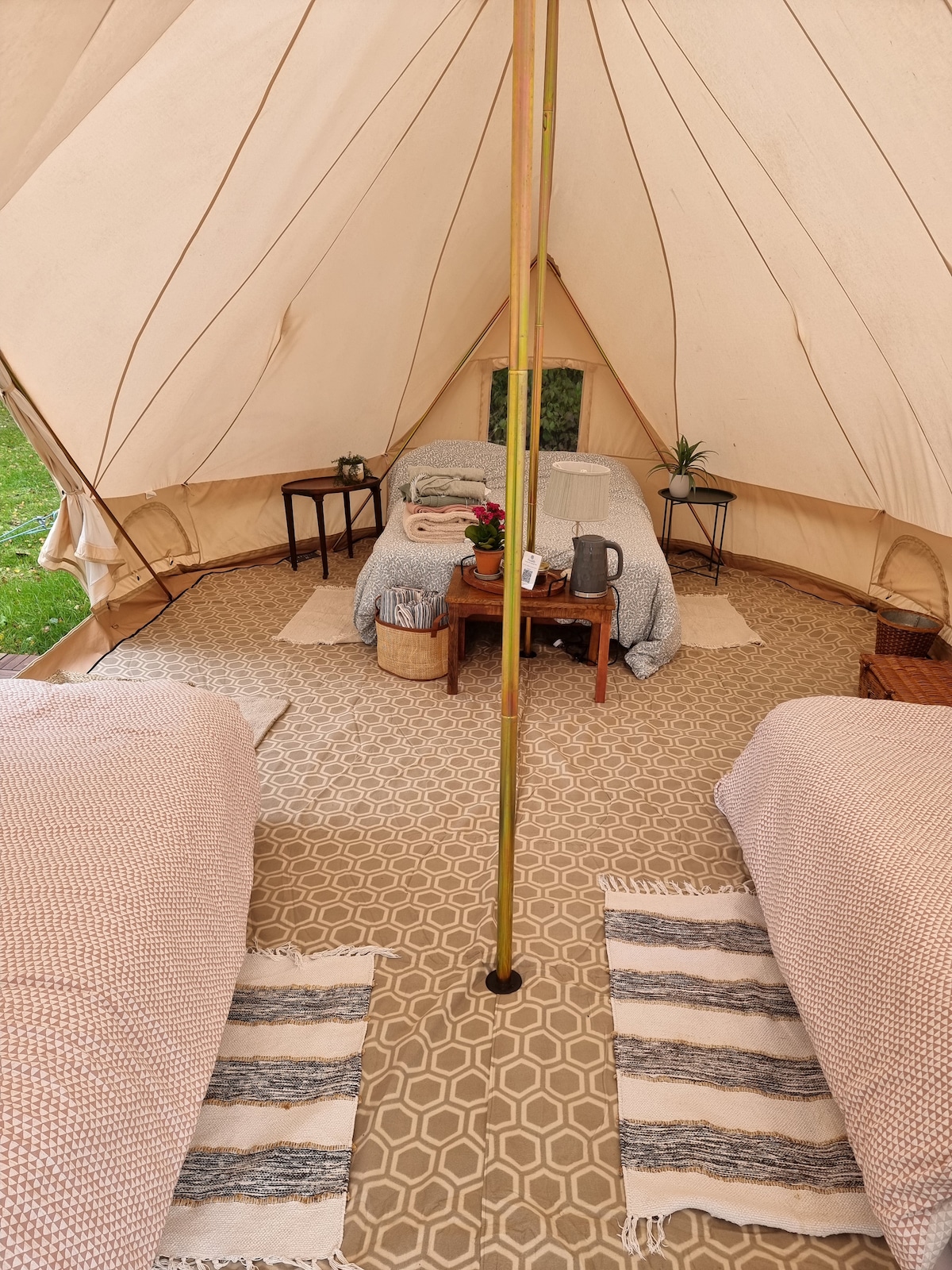 A charming bell tent. A budget friendly version of glamping. This large bell tent is unfurnished. Offering a hassle-free, comfortable, and time-saving camping experience, perfect for both beginners and seasoned campers looking to enjoy the great outdoors with minimal fuss. This is an unfurnished, the tent will already be erected upon your arrival, all you have to do is bring the rest of the camping equipment. It sleeps 2 to 4 guests.