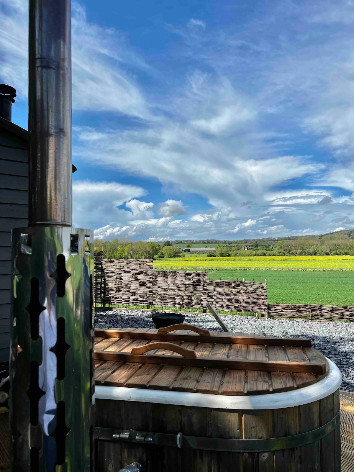 A unique and spacious shepherd's hut on a peaceful and private farm in Eckington in the Cotswolds. The wood-fired Hikki Sweden hot tub is available for guests to use 24/7, with stunning countryside views. We provide several logs and kindling on arrival. Perfect for a weekend getaway for 2 with a comfy double bed, working kitchen, and shower room. The view from the hot tub is of Bredon Hill, and most mornings, you will see the herd of deer pass through the field.