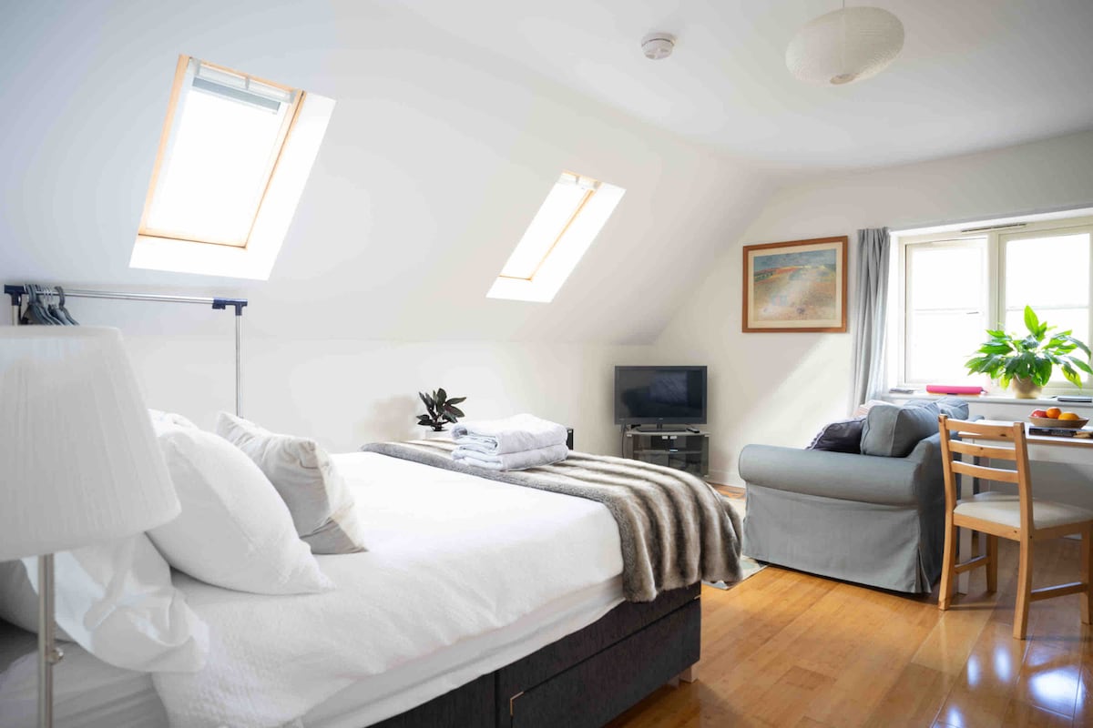 Welcome to our peaceful first-floor apartment, recently converted for quiet luxury with iconic mid-century design pieces, antique finds, and contemporary artwork from your professional artist hosts. Accessible via a wide spiral staircase, this private retreat features a spacious and comfortable sitting room with light-filled double-aspect sash windows, a balcony with idyllic paddock views, a mini-kitchen and a large separate bedroom. Perfect for couples, business travelers, sorry, no infants.