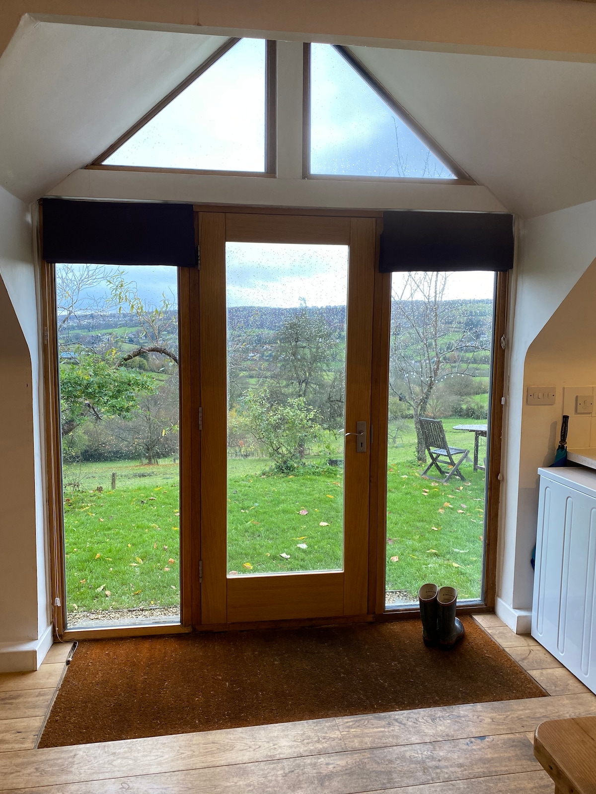 A light & sunny open-plan lodge, with private deck & lovely views over open fields. Fully equipped kitchen, TV, wifi, king size bed, sofa bed, dining table, shower room and utility room with washing machine. It has a strong environmental theme throughout the building being highly insulated, built using natural materials and equipped with solar panels, heat recovery ventilation & upcycled furniture. Across the drive, there’s an 8 acre fenced field great for dog owners to exercise their dog.