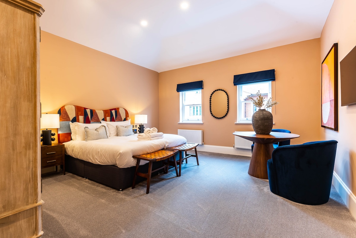 This all-encompassing, deluxe suite features a separation between dining and sleeping. The bedroom looks out over the immaculate Abbey Gardens and is furnished with a plush king bed, stylish desk, seating area, ample clothes storage and a stunning en-suite bathroom. The fully equipped kitchenette (including a hob, microwave-oven, kettle, utensils, pans and crockery) is carefully partitioned to allow for a spacious dining table and cooking area.