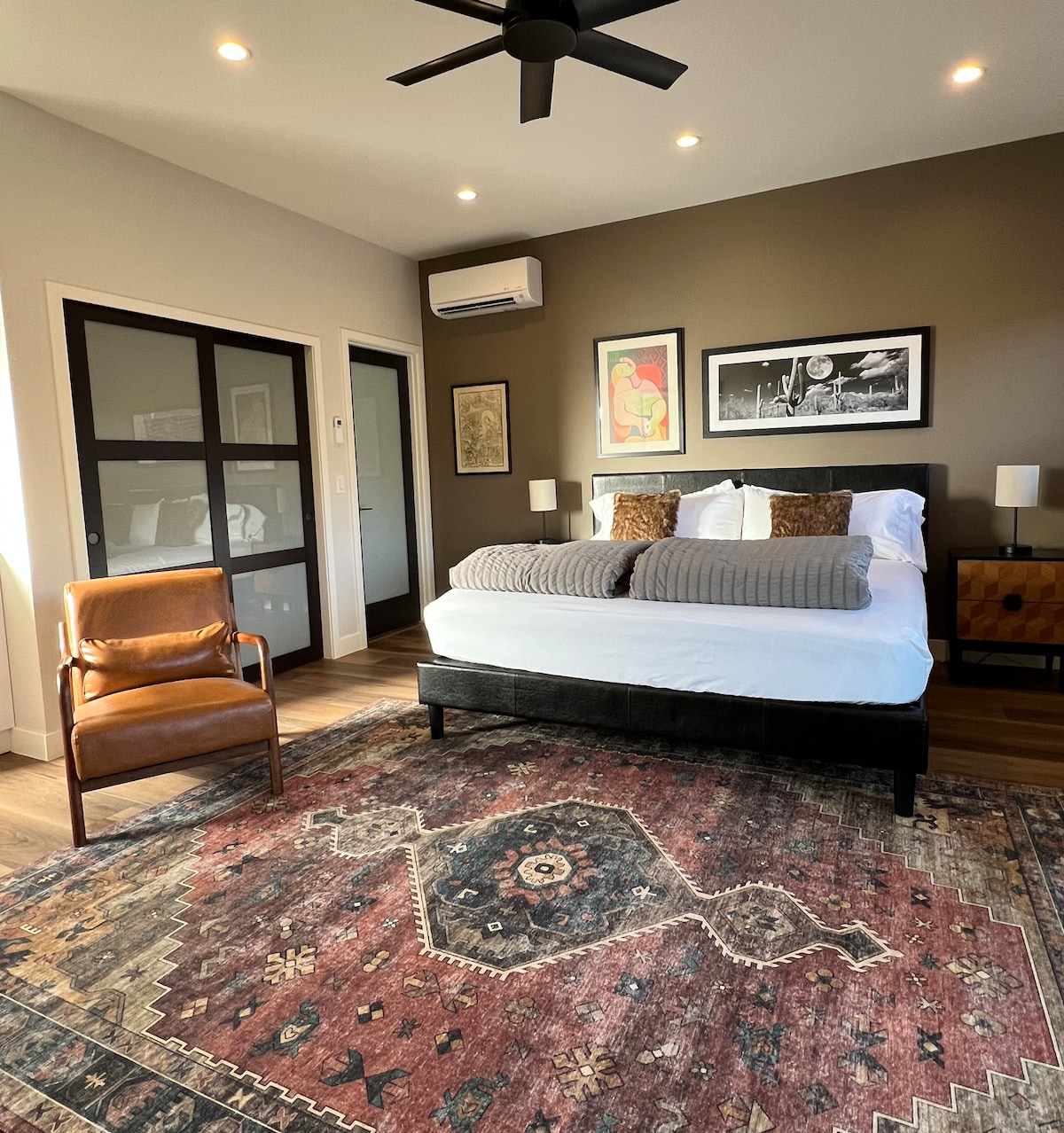 This newly renovated (2025) modern desert studio offers the perfect blend of privacy and comfort. While attached to the main house via double exterior soundproof doors, it has its own separate entrance, ensuring complete privacy and a peaceful retreat. Inside, you’ll find a luxurious CA king-size bed, creating the ideal space for rest and relaxation. Large windows frame breathtaking views of the surrounding desert, filling the studio with natural light and offering a serene, calming atmosphere.