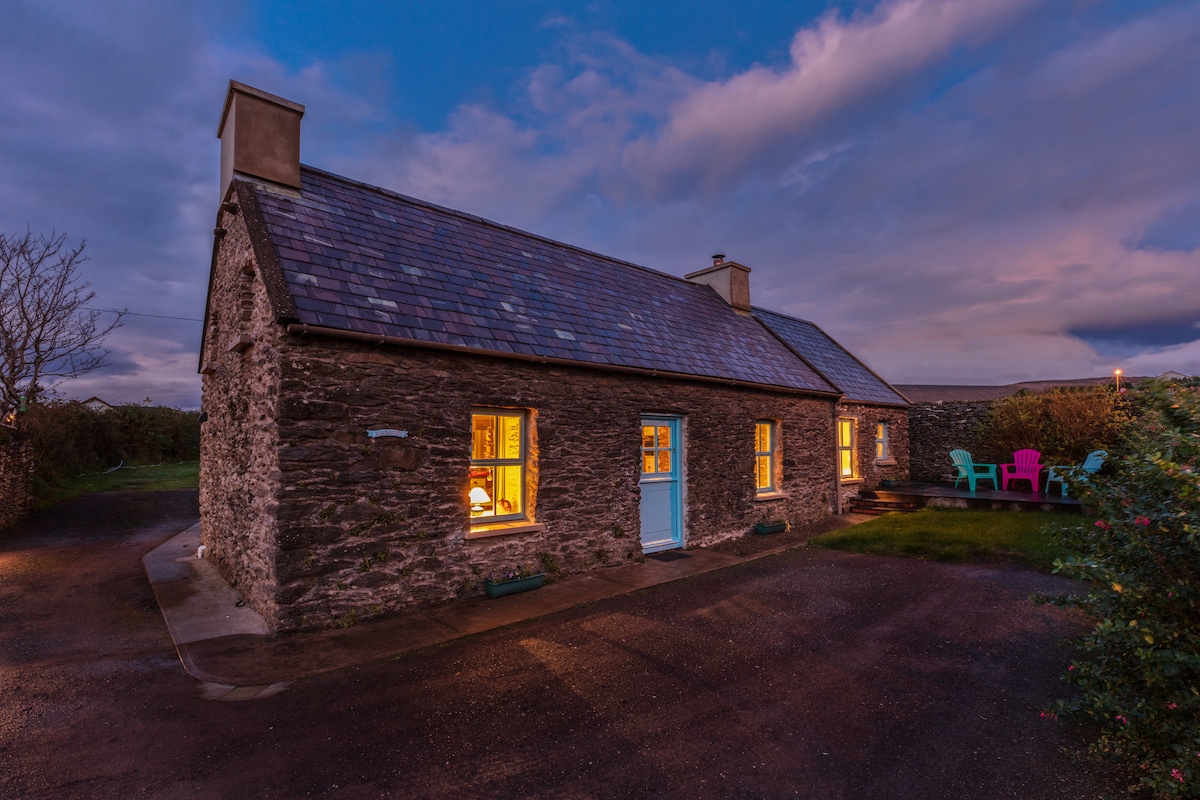 Overlooking the Wild Atlantic Ocean with amazing views of the Blasket Islands... On the world famous Slea Head Drive snd the Dingle Wild Atlantic Way.. Enjoy fabulous sunsets and Moon and star views .The cottage is gated with all modern conveniences and plenty natural light coming into all rooms.. Most rooms enjoy fantastic sea views and extensive views of Mount Eagle. The property is adjacent to the dingle way walk.A short drive to stunning beaches. Smart tv for your Netflix ! And YouTube