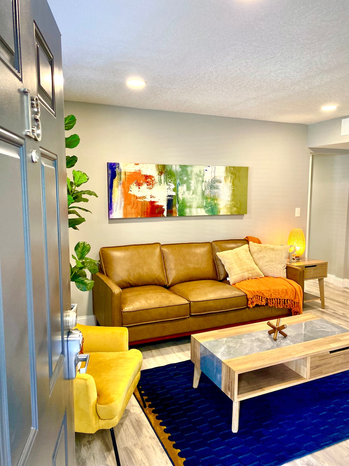 Step into a private and cozy space. Relax watching TV in bed or on the couch. This place is part of our walk out basement, so you may hear day to day living upstairs. For your safety there is a Ring camera installed at the entrance and will light up the entryway when it’s dark. Parking is on the well lit public street. Easily walk up our dedicated Airbnb sidewalk, no steps, walk around to the back of the house. You’ll be in a serene space that makes you feel right at home.