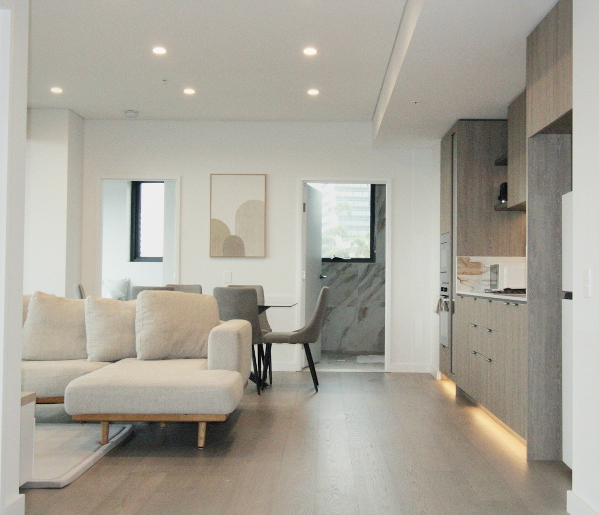 Welcome to a brand new, light-filled 3-bedroom residence in the heart of Zetland, thoughtfully designed for professionals, families, and extended stays. This is not a party apartment, it’s a calm hotel-level home created for guests who value comfort, space and a quiet residential setting. The apartment comfortably accommodates up to six guests, with three well-separated bedrooms dressed in hotel-quality linen and premium bedding.
