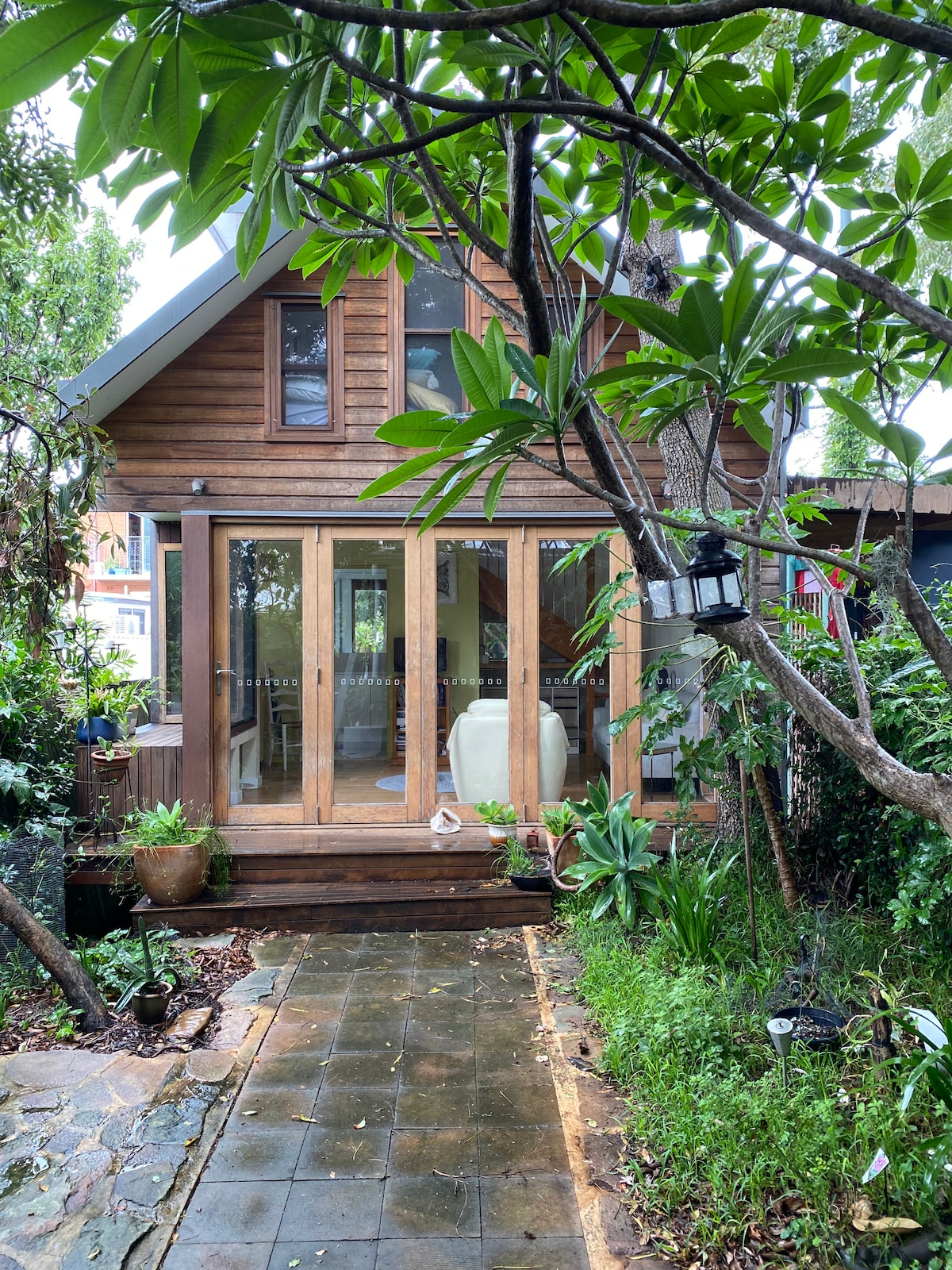 Charming self-contained garden chalet in Inner Sydney in small leafy backyard off Blackwattle Bay. Access through house. Cook St is off Glebe Pt Rd with its cafes, pubs, bookshops, amenities, and Broadway Shopping Centre. 10 min walk thru park to TramSheds. Ferry to Barangaroo at bottom of road. Buses, lightrail to fish markets, Darling Harbour, markets, Central. Universities close. Friendly neighbours, parrots, possums, kookaburras. Happy dog, owner onsite. Will sleep 3 but 2 most comfortable.
