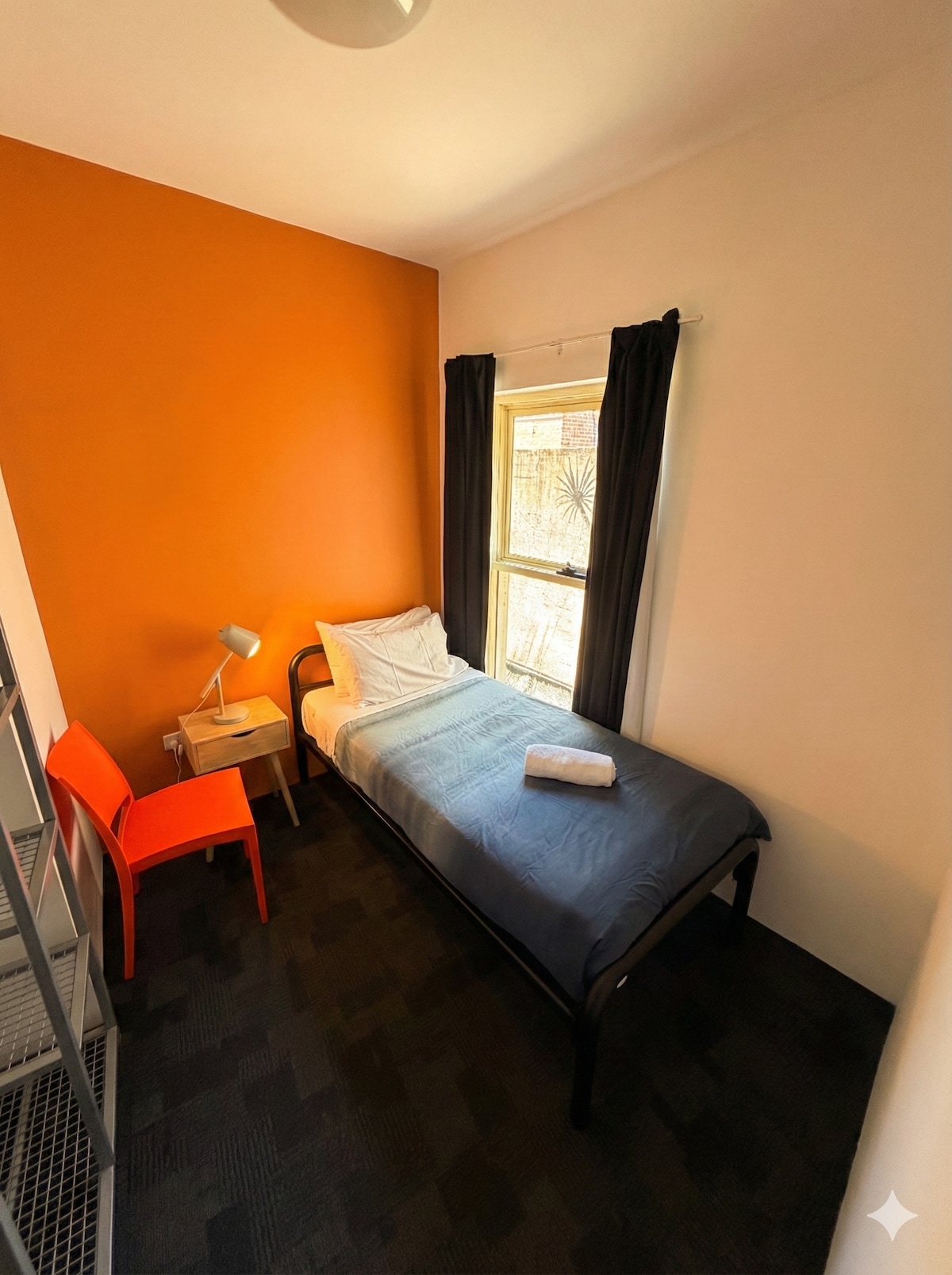 Private room with queen bed plus single bed, private ensuite, Smart TV, open wardrobe, air-conditioning, kettle with tea and coffee, towels and bed linen provided.