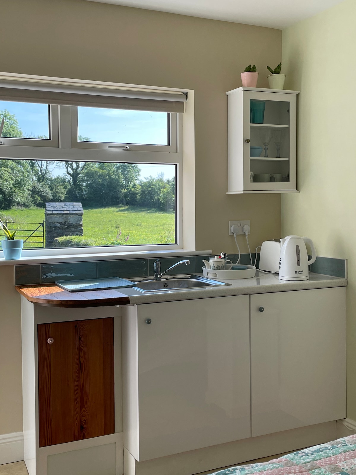 The Alpaca Lodge is a free standing stone building next to our farmhouse in a rural location (16km from Kenmare), surrounded by our herd of friendly free-roaming alpacas and llamas, with stunning views of Kenmare Bay. It has a cozy bedroom with a king-size bed, a small seating area and en-suite bathroom. Cereal, milk, porridge, orange juice, snack bars and biscuits are provided in the room, and there is a kettle, microwave, toaster and a small fridge, tea & coffee, cutlery & plates . AGE 12+