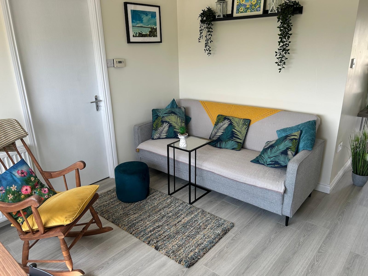 Situated close to Mourne Mountains and 10 minutes walk to Newcastle centre and beach. Very quiet area. Close to main house with small kitchen with microwave, fridge, kettle and toaster (no cooker/hob). Basic breakfast essentials will be left.Bread cereal tea bags coffee milk and butter. Double bedroom, bathroom, sitting area/kitchen and free parking. Beautiful view and small outside seated area.