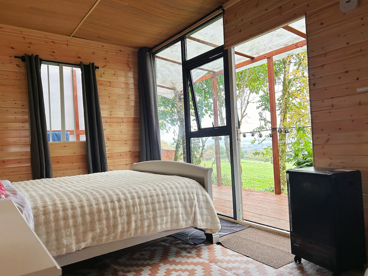 Escape to your private, fenced cabin with stunning mountain, city, and sea views. Cabins amenities include- a bathroom with a hot shower, a coffee machine, filtered water, kettle, gas heater, electric blanket, and WiFi, plus access to a shared full kitchen. Unwind in our sauna or hot tub for a small fee . Feel free to meet our farm animals(horses, alpacas, goats, and sheep. Etc) . A direct bus to the city center is just 350m away. As we are a farm ,it’s not suitable for infants or the infirm
